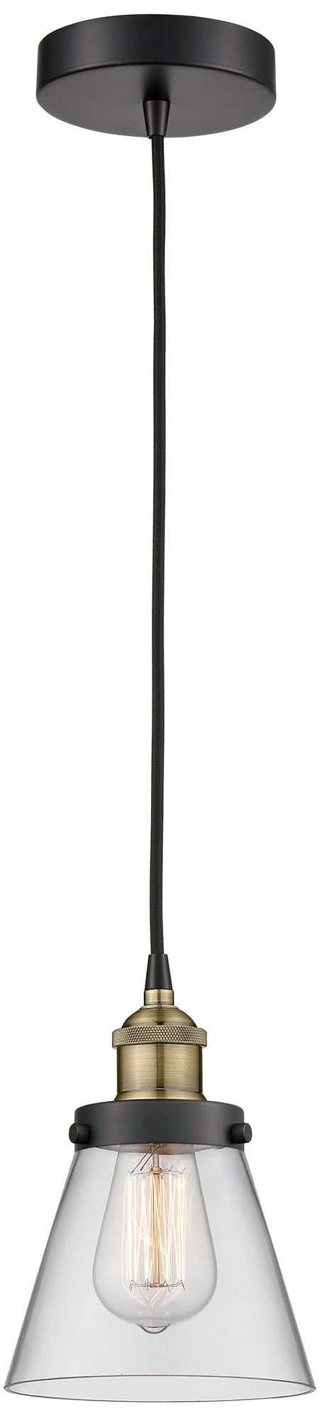 Cone 6.25" Wide Black Brass Corded Mini Pendant With Clear Shade