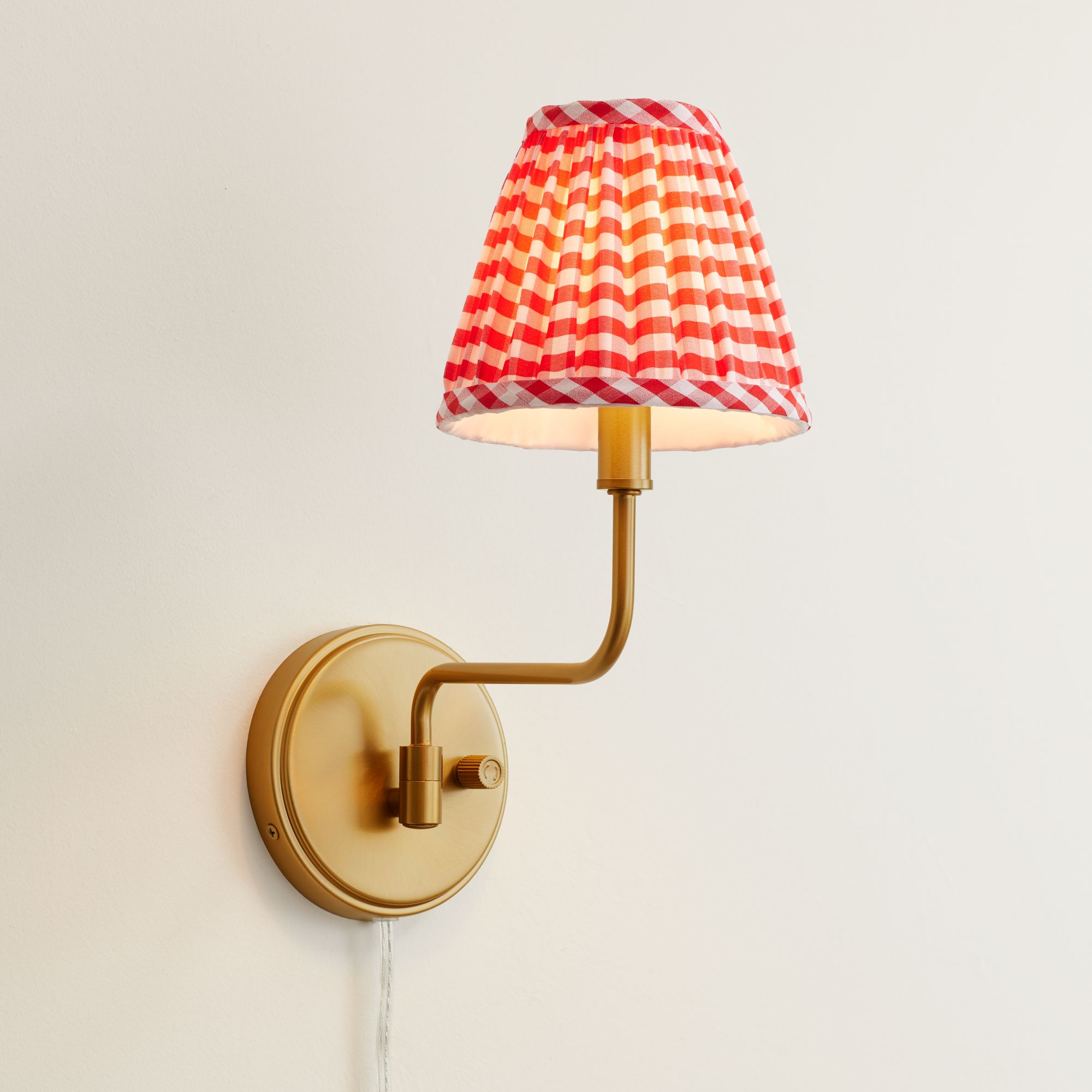 Ophelia 9 1/2"H Warm Brass Plug-In Wall Sconce Red Plaid Scallop Shade