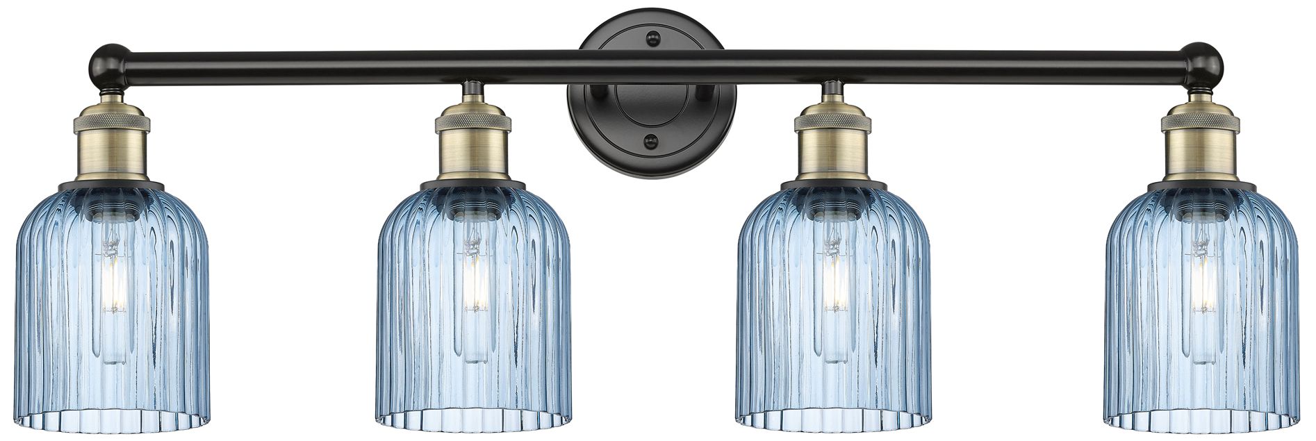 Edison Bridal Veil 4 Light 32" Bath Vanity Black Brass Princess Blue Shade