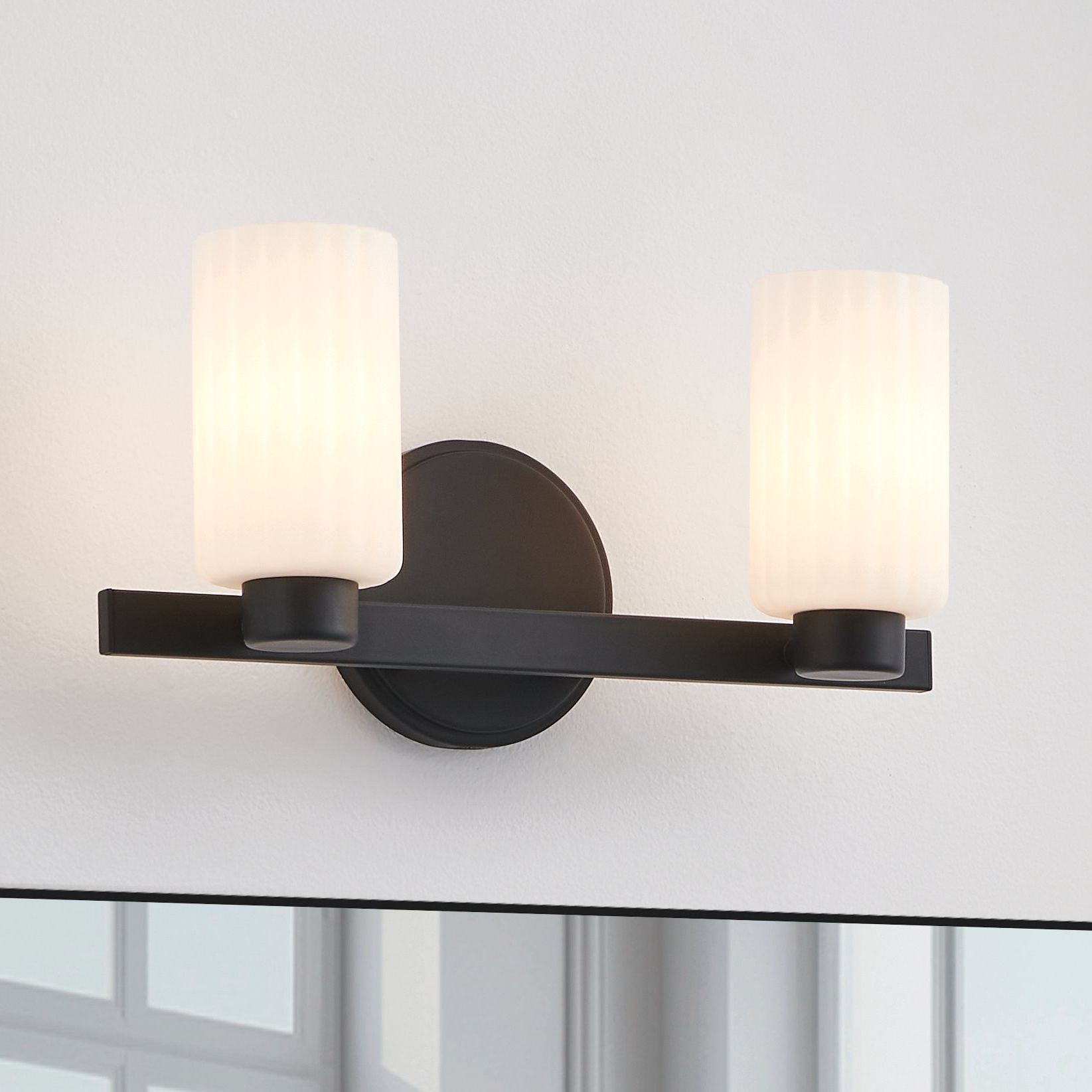 Thesis Bedminster 14" Matte Blk Vanity Light, Etched Opal Ribbed Glass