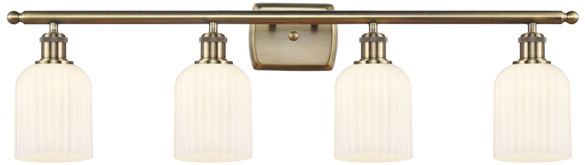 Bridal Veil 32"W 4 Light Antique Brass Bath Light w/ Gloss White Shade