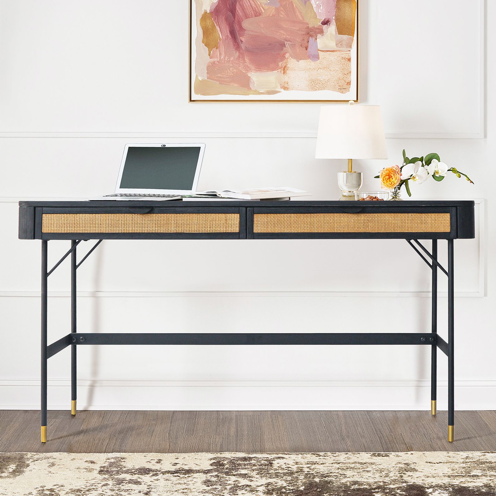 Saratoga 2 Drawer Desk with Rattan in Acacia Wood and Metal