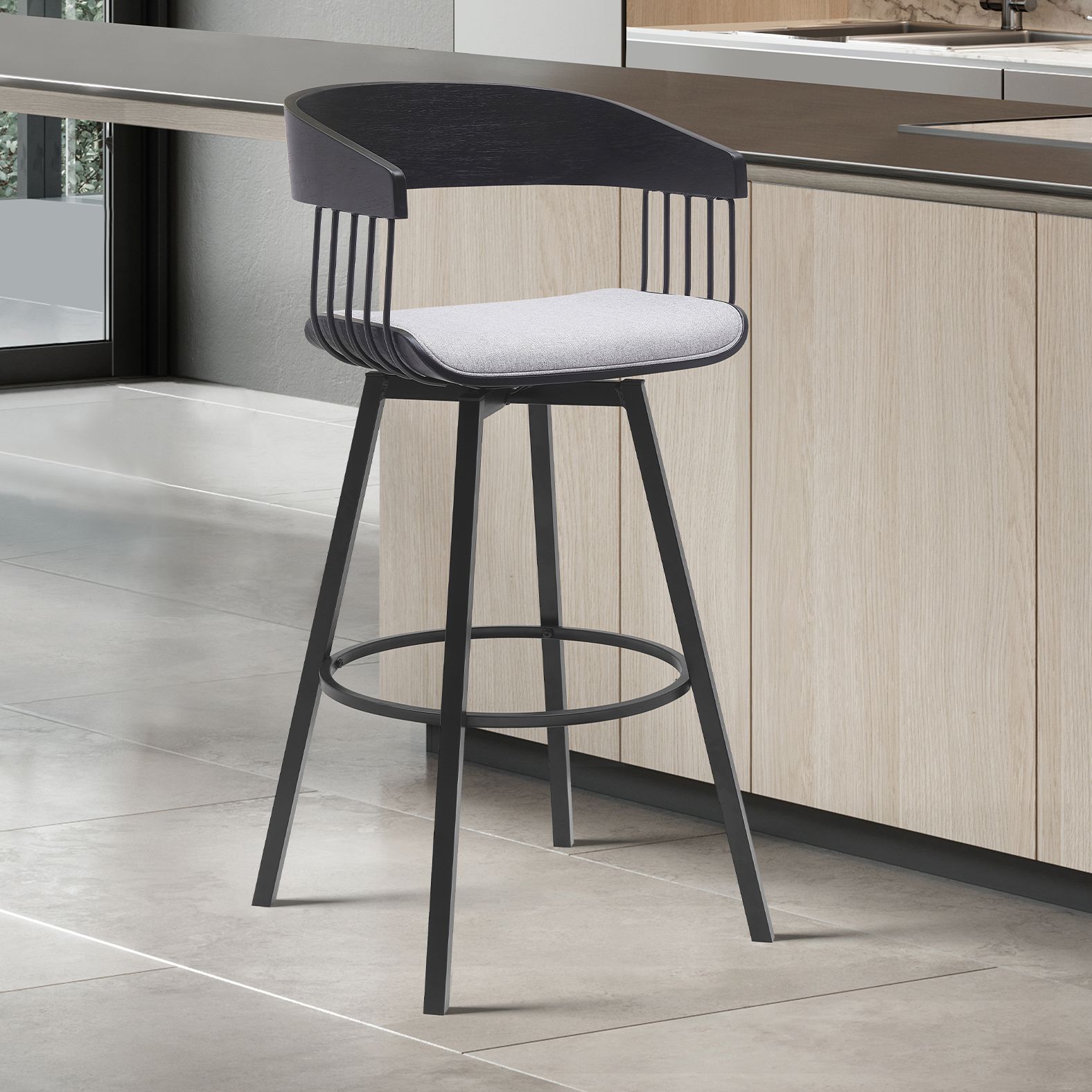 Athena 27 in. Swivel Barstool in Black Wood, Metal and Light Grey Fabric