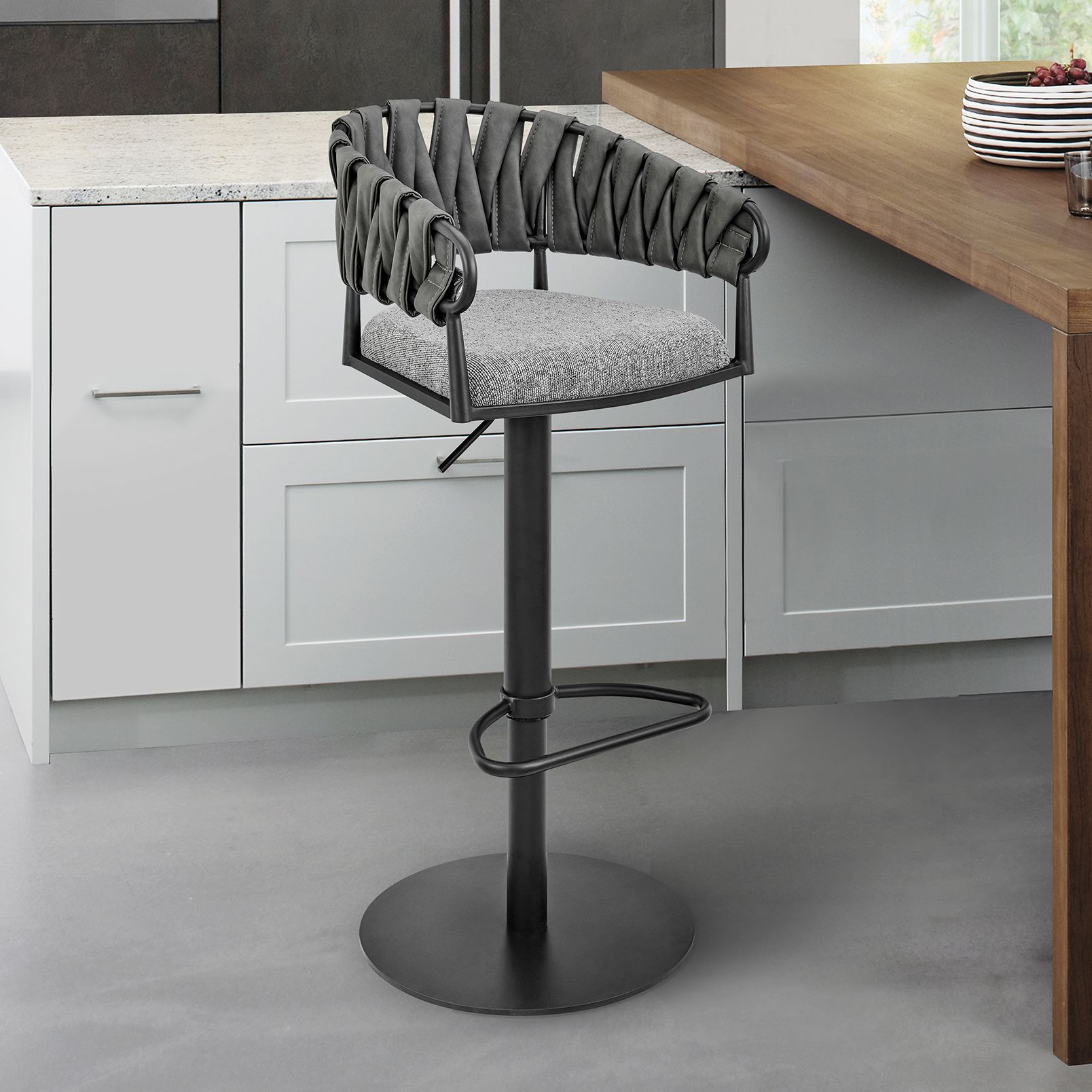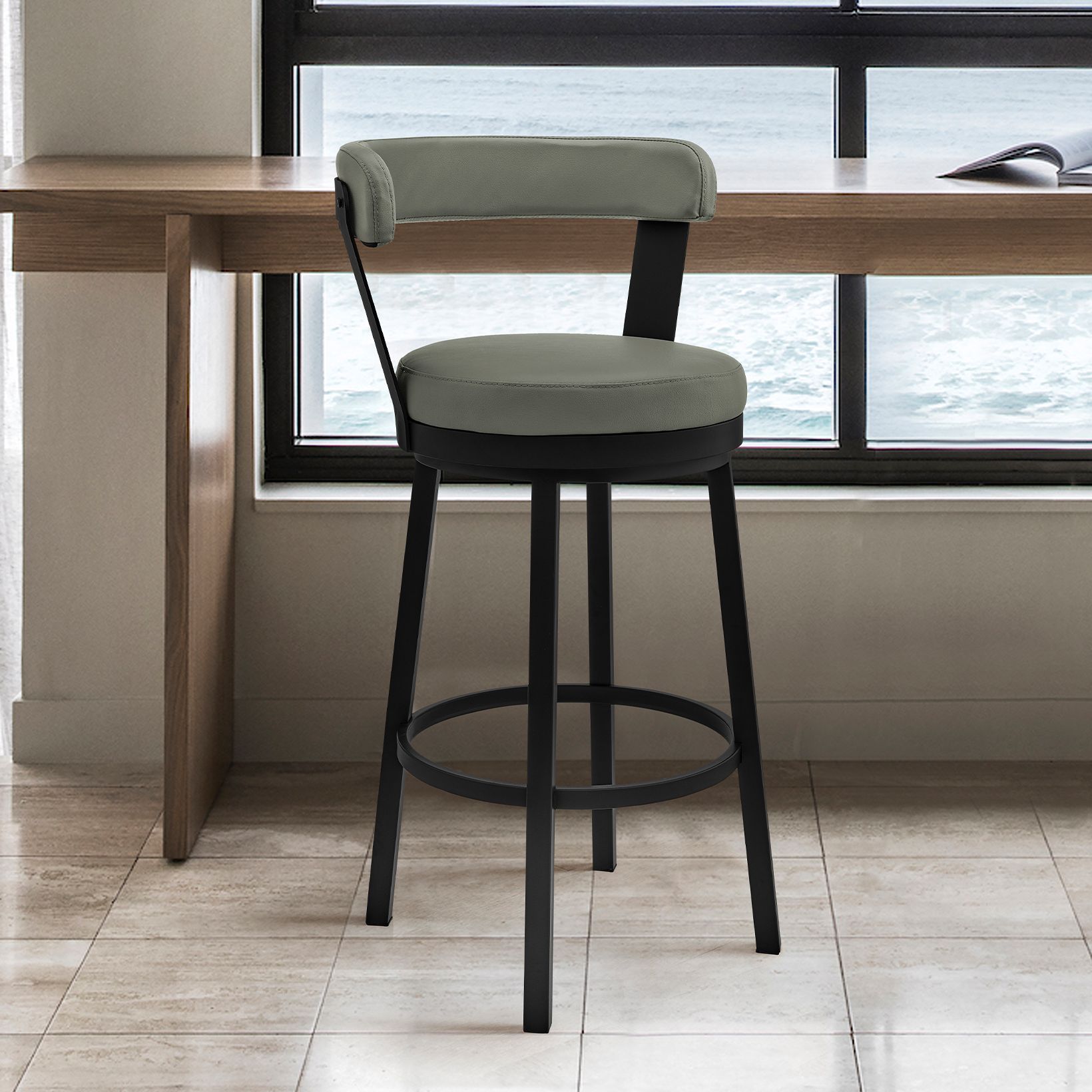 Bryant 26 in. Swivel Barstool in Black Finish, Gray Faux Leather