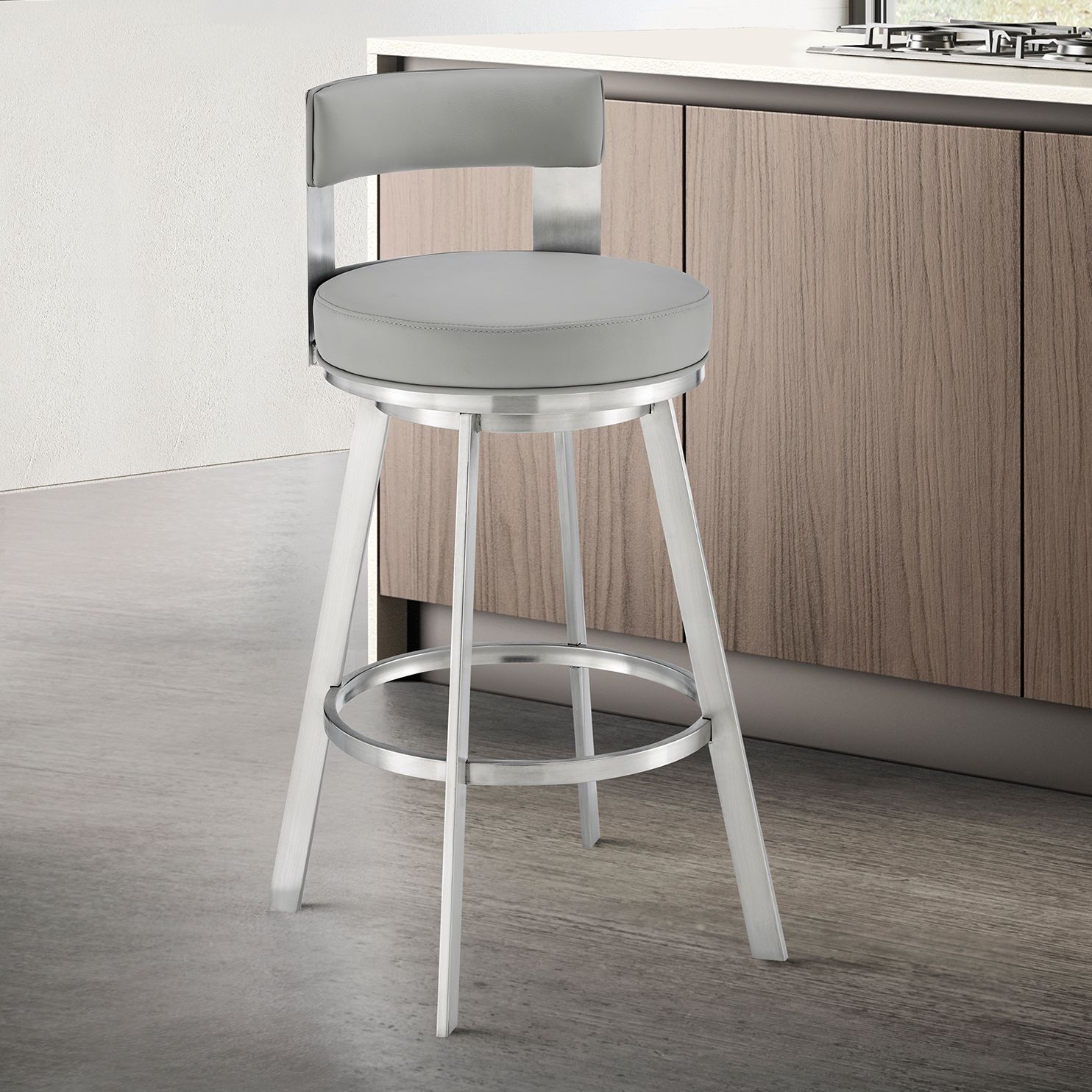 Lynof 30 in. Swivel Barstool in Stainless Steel, Light Grey Faux Leather