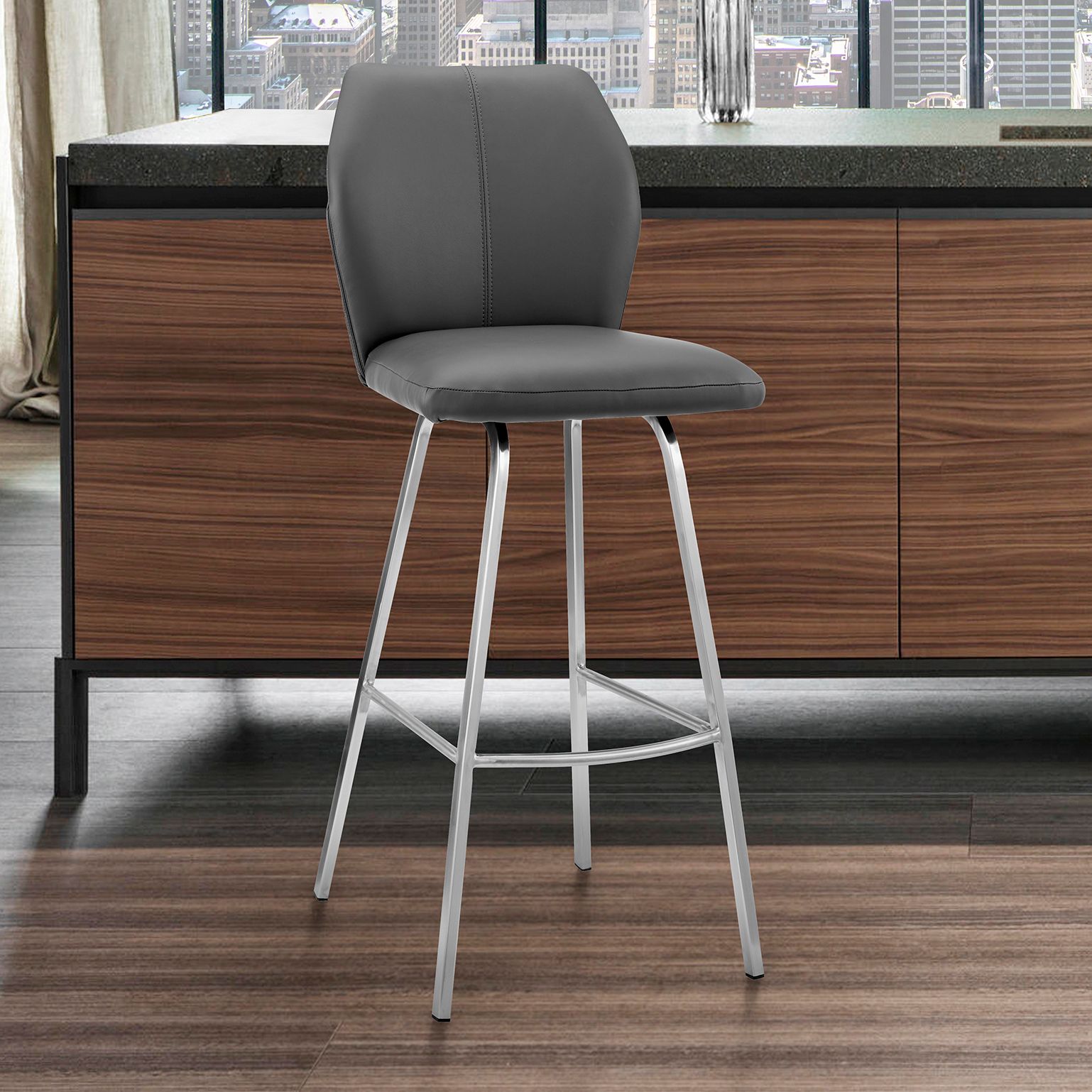 Tandy 26 in. Barstool in Brushed Stainless Steel Finish, Gray Faux Leather