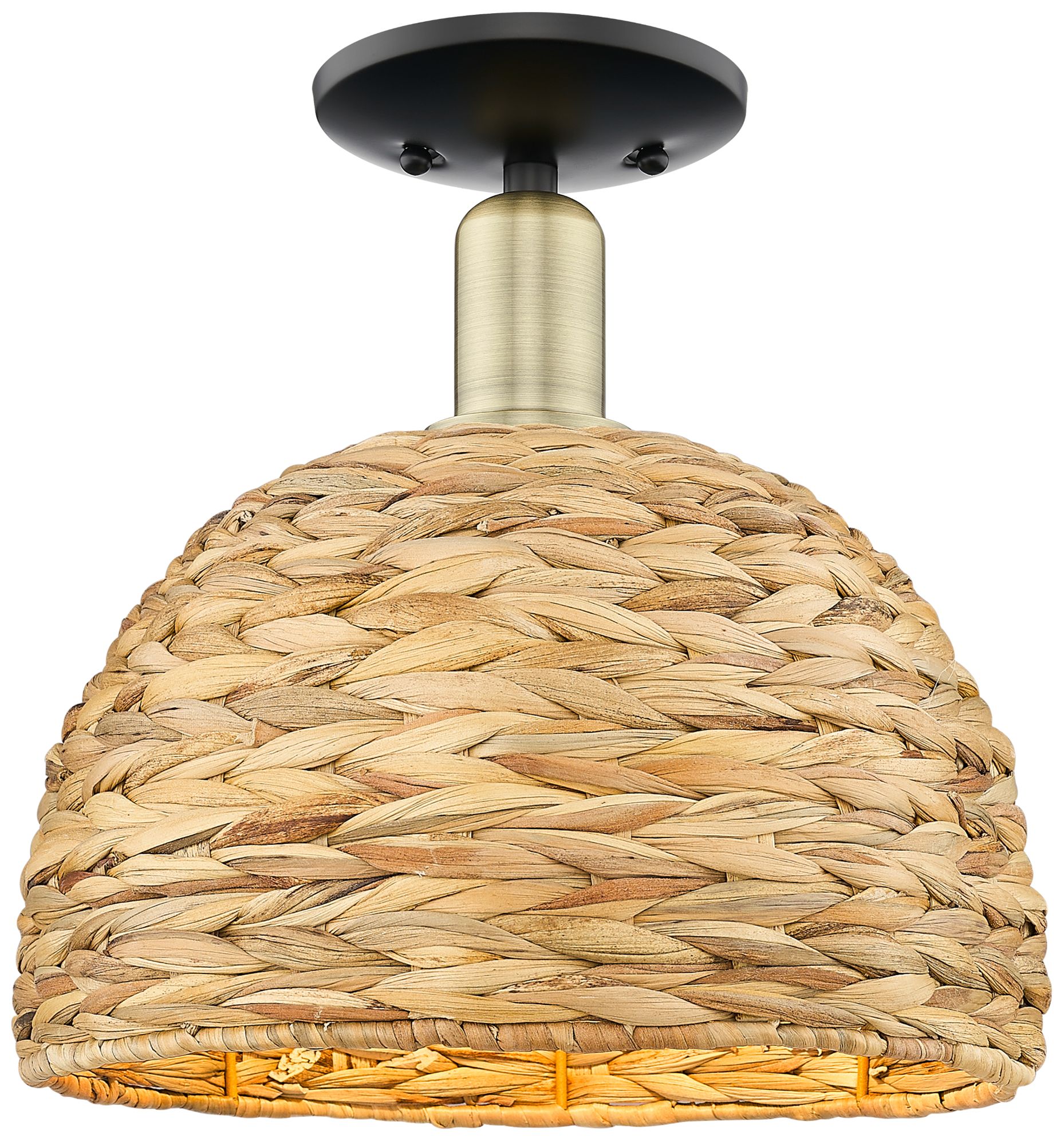 Woven Rattan 12" Wide Black Antique Brass Semi-Flush Mount w/ Natural Shade