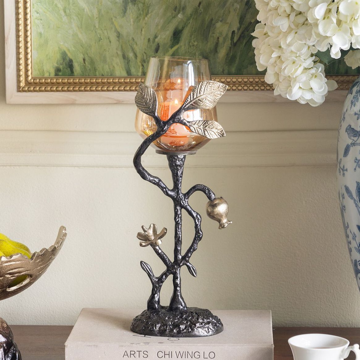 Iron Arched Pillar Candle Holder with Gold Floral Design