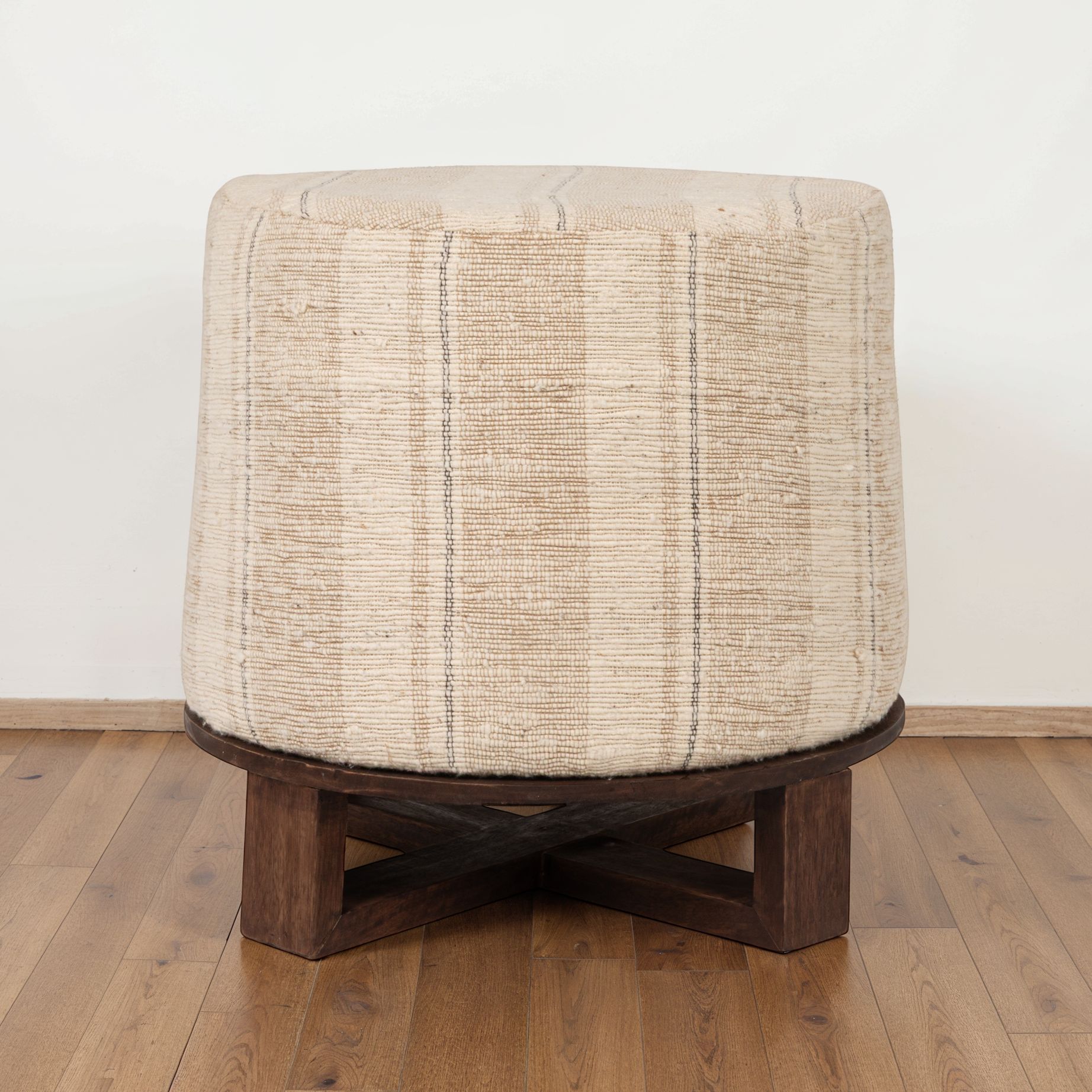 Cotton Woven Round Ottoman Stool in Striped Upholstery with Dark Wood Base