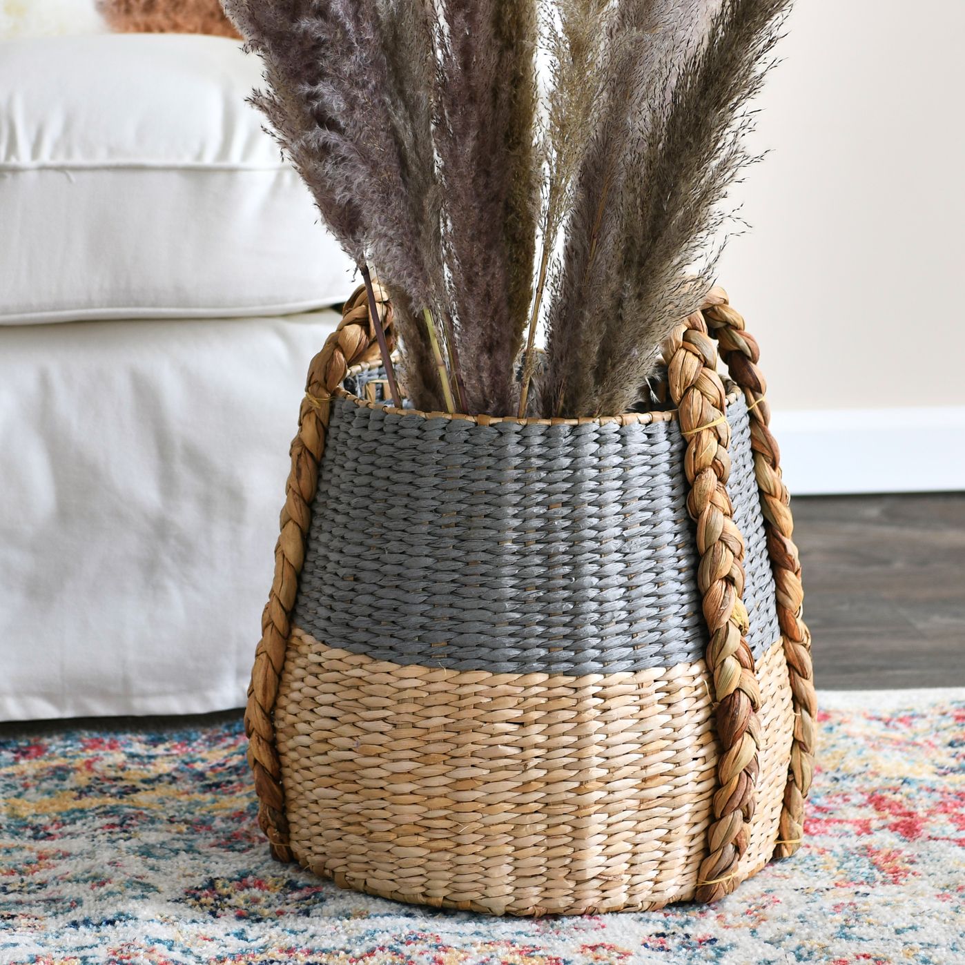 Round Woven Basket with Handles, Water Hyacinth Wicker Basket with Handles