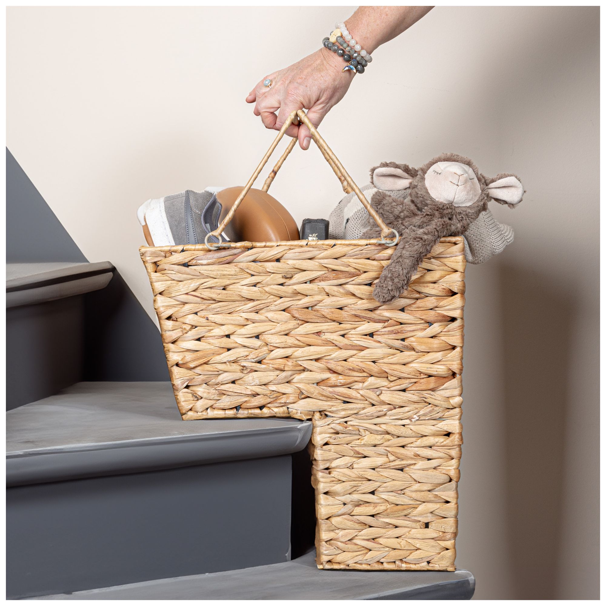 Wicker Stair Basket with Handles, Handwoven, Sits on Two Stairs