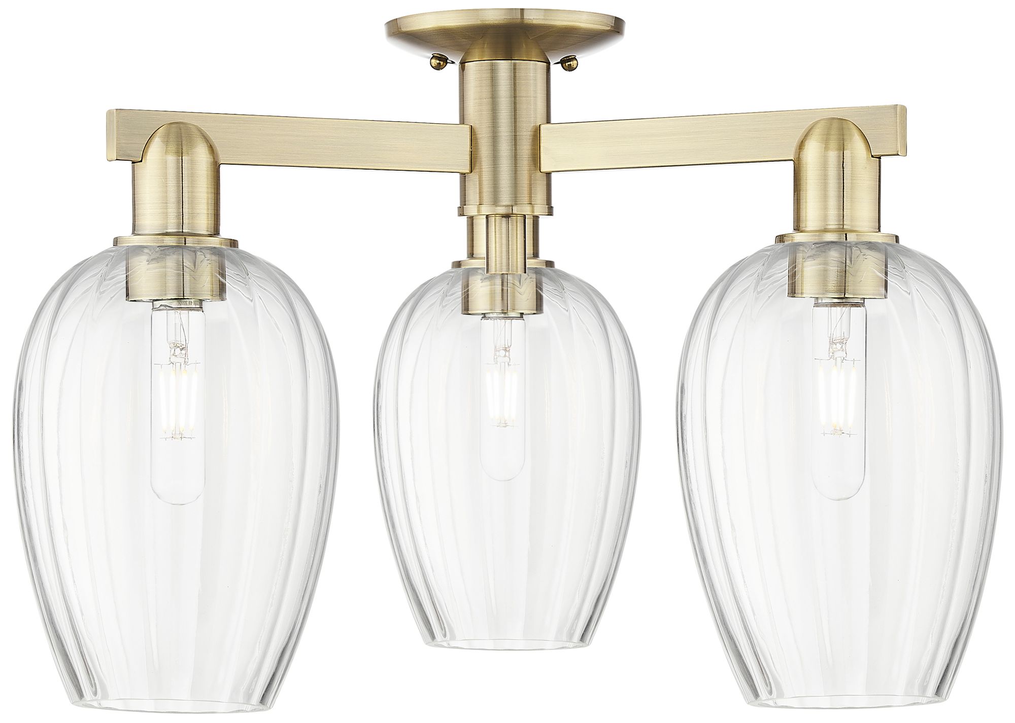 Preston 24"W 3 Light Antique Brass Semi-Flush With Clear Flute Shade