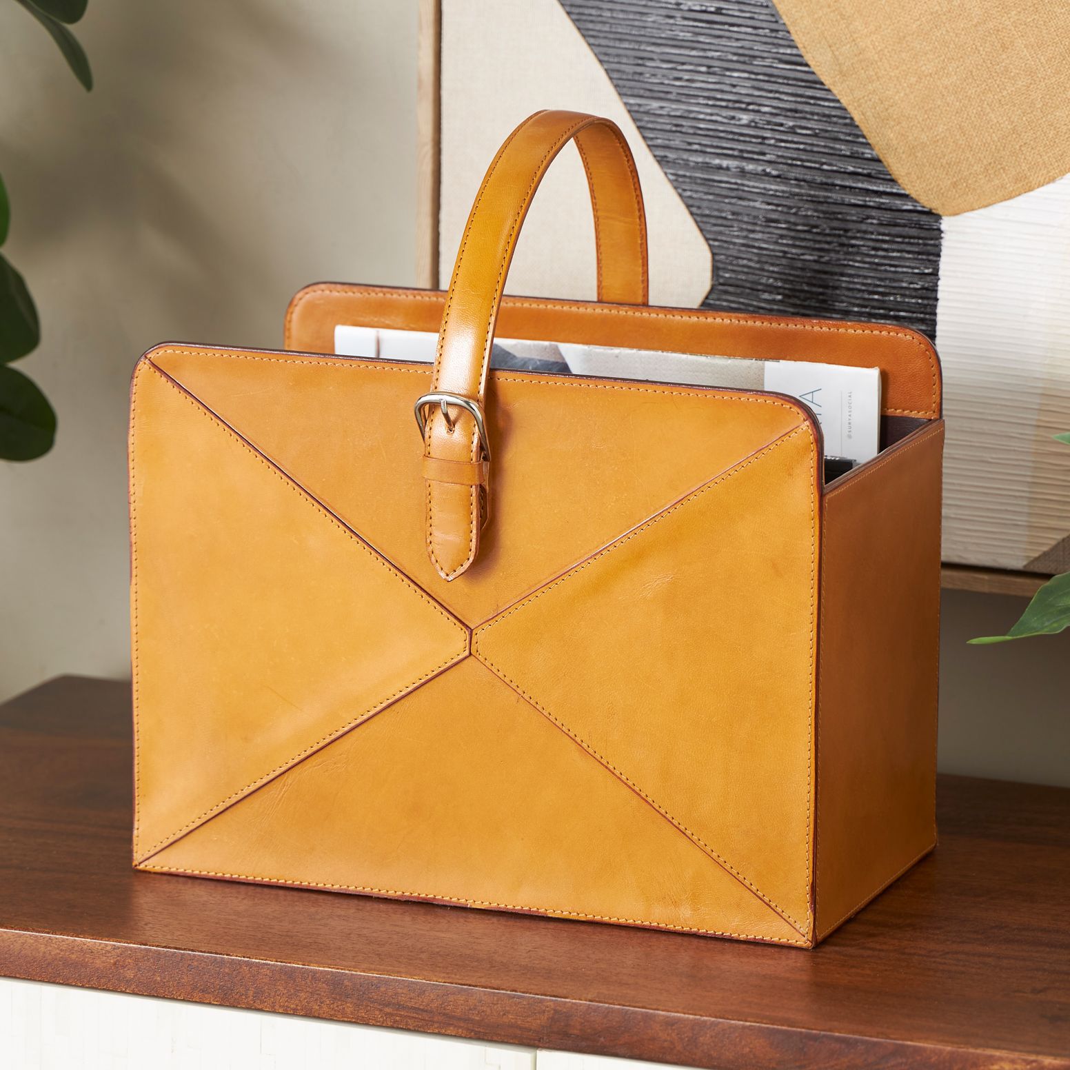 Brown Leather Modern Magazine Holder, 15" x 10" x 17"