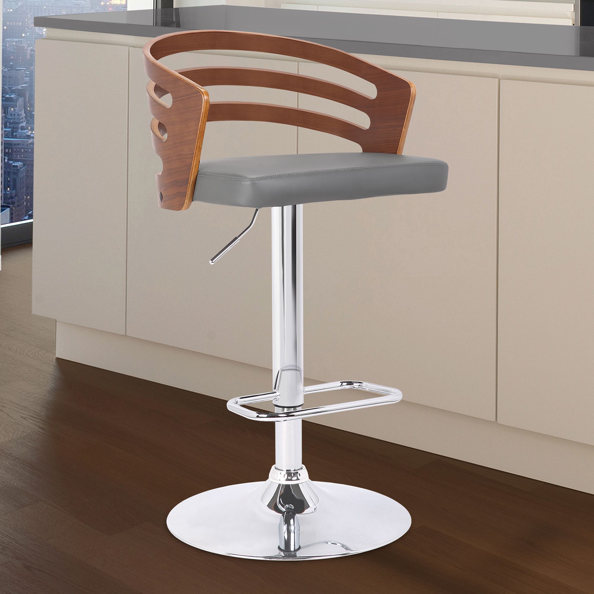 Adele Adjustable Swivel Barstool in Grey Faux Leather and Chrome Base