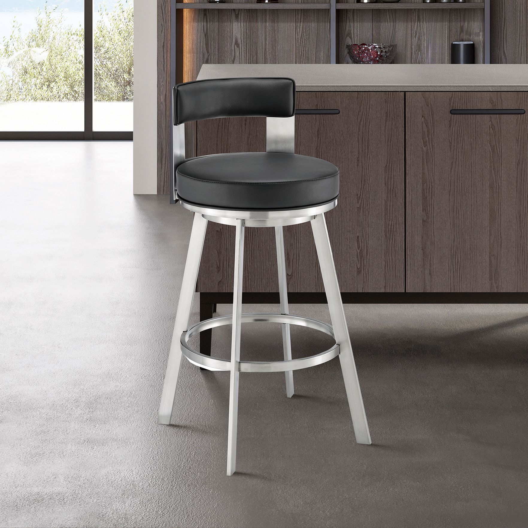 Flynn 30 in. Swivel Barstool in Black Faux Leather, Stainless Steel