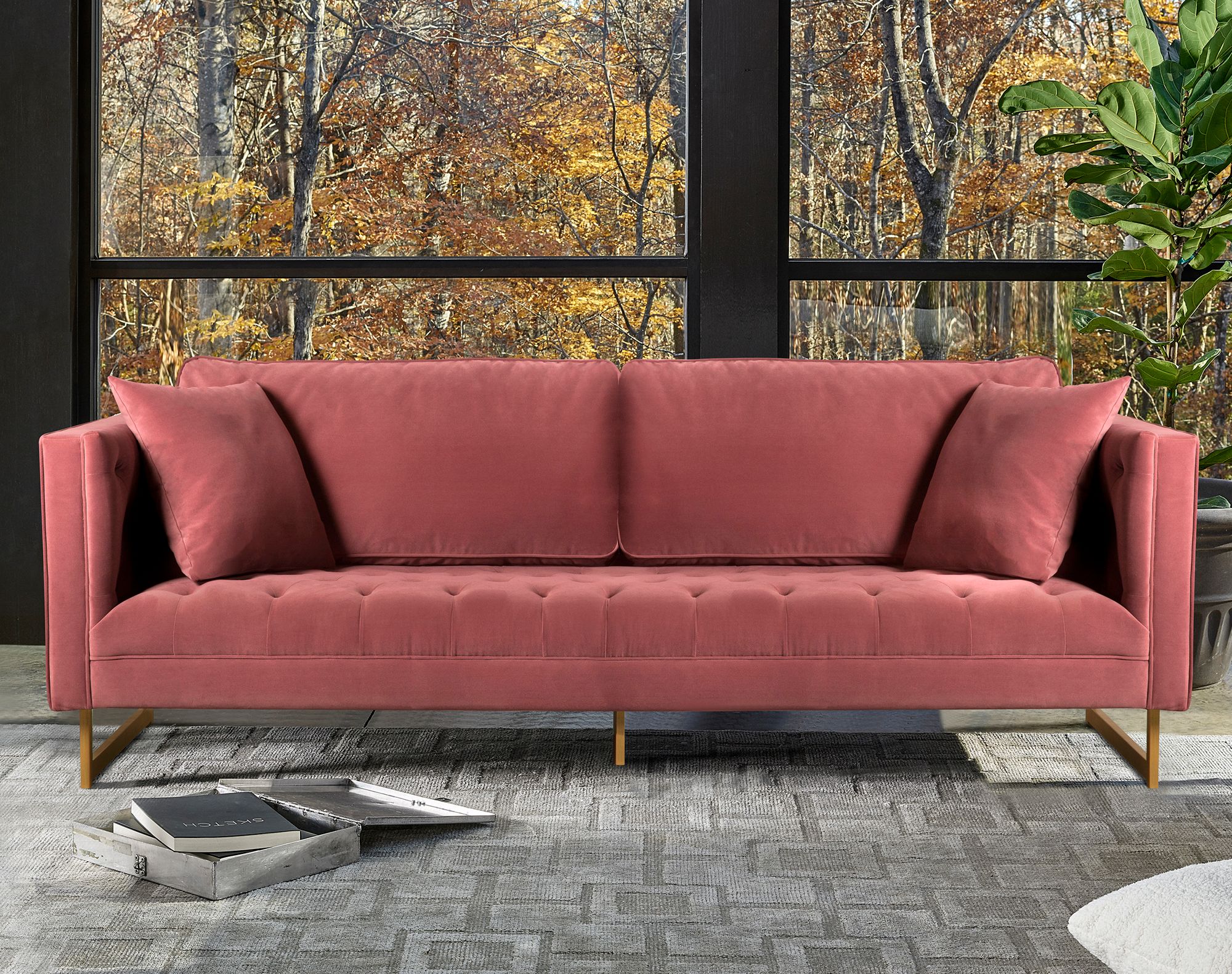 Lenox 90 In. Sofa in Pink Fabric and Brass Legs