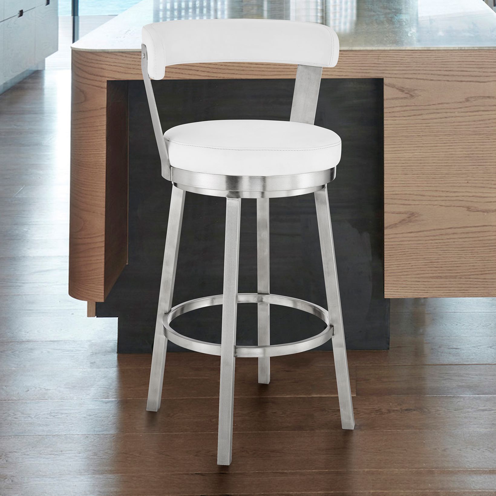 Bryant 30 in. Swivel Barstool in Stainless Steel, White Faux Leather