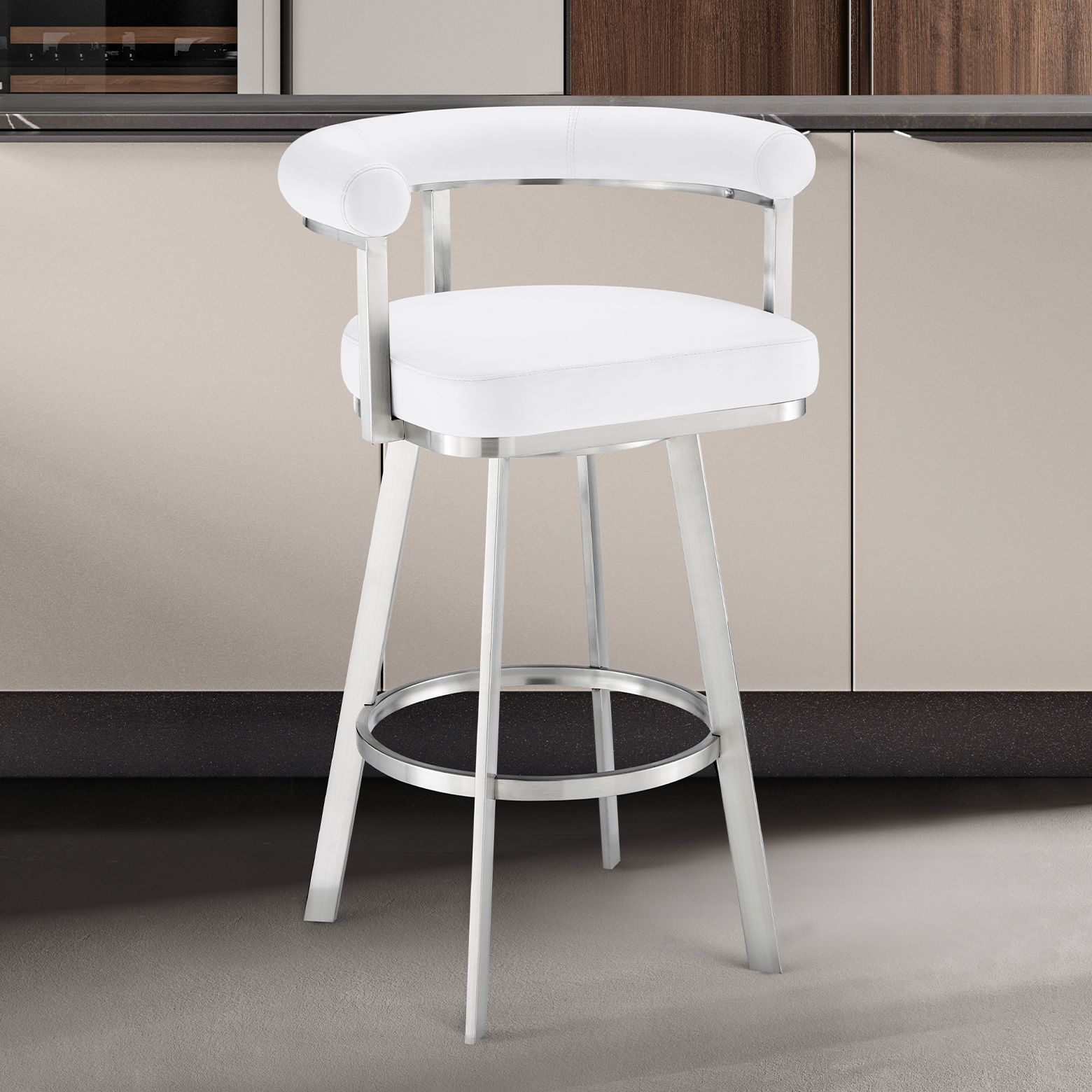 Magnolia 26 in. Swivel Barstool in White Faux Leather, Stainless Steel
