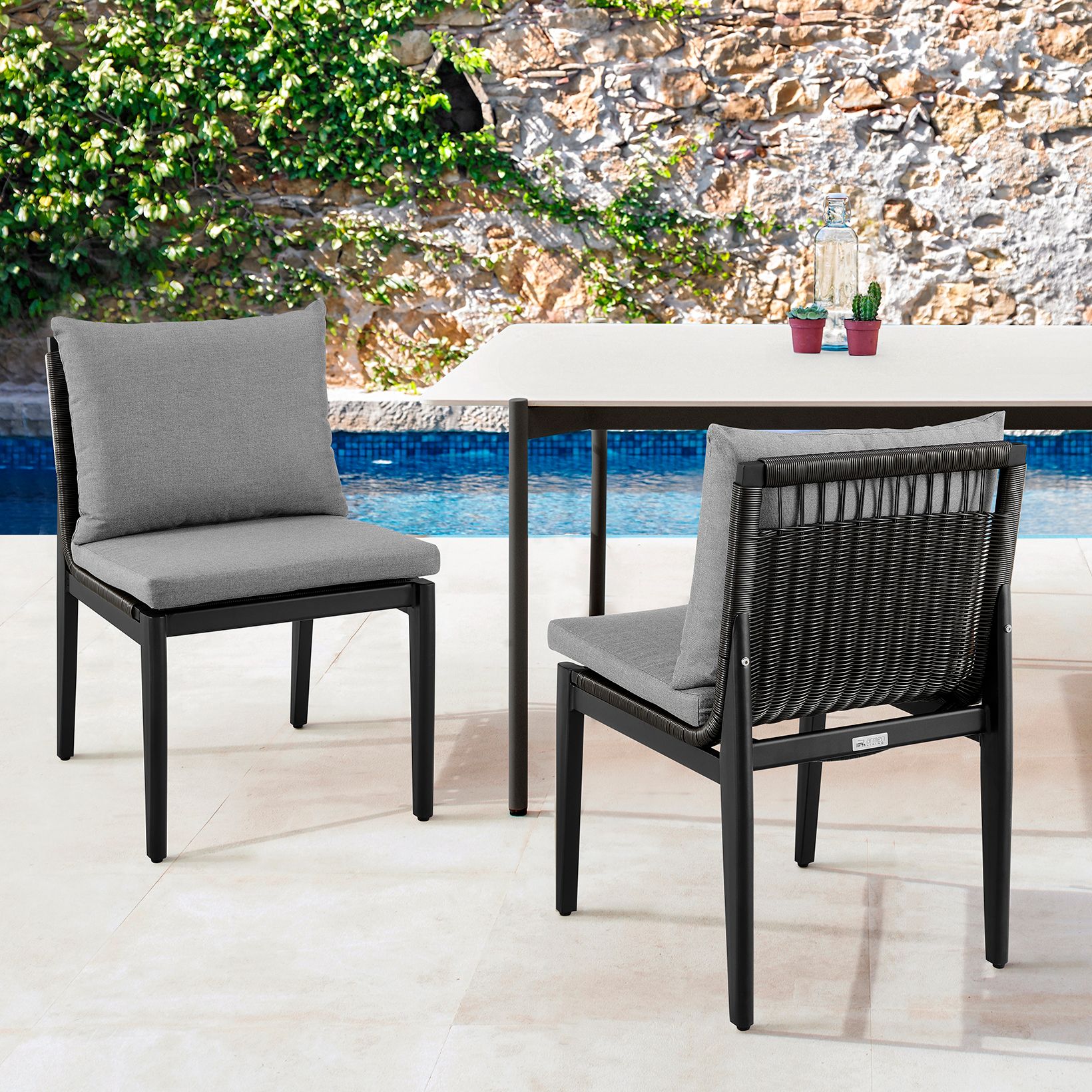 Grand Set of 2 Outdoor Patio Dining Chairs in Aluminum with Grey Cushions