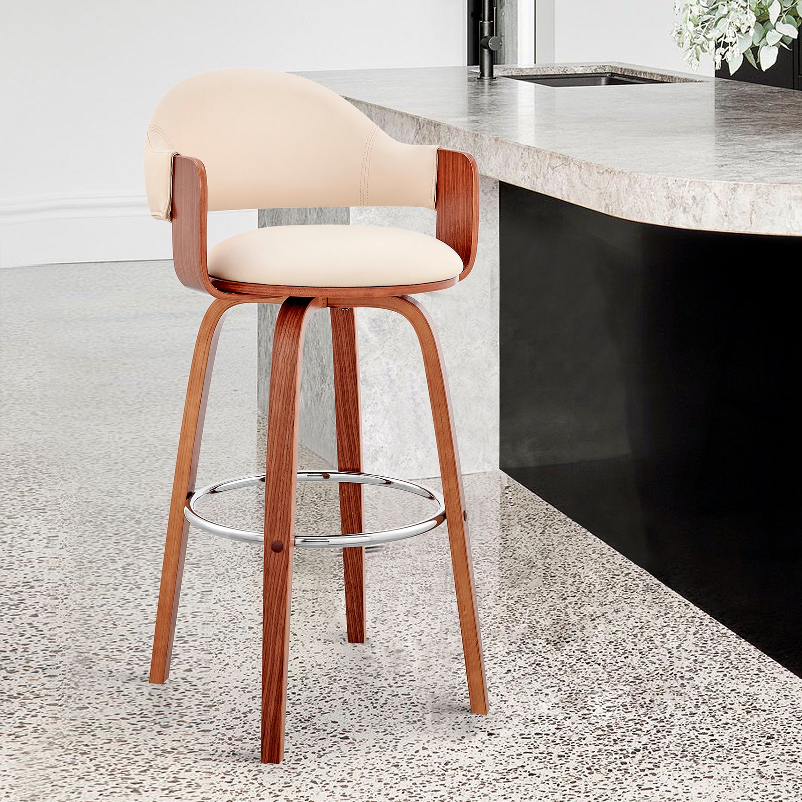 Tyler 30 in. Swivel Barstool in Cream Faux Leather and Walnut Wood