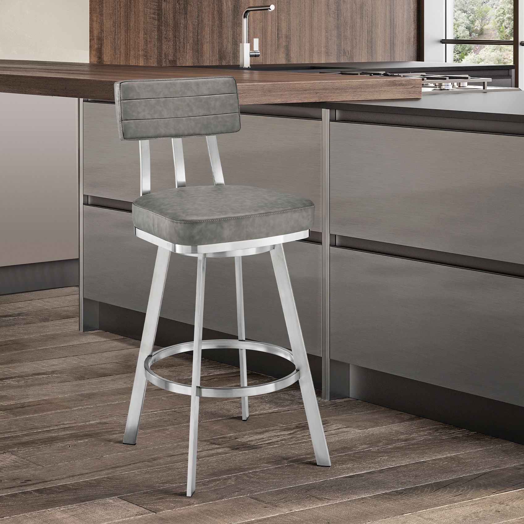 Benjamin 30 in. Swivel Barstool in Gray Faux Leather, Stainless Steel