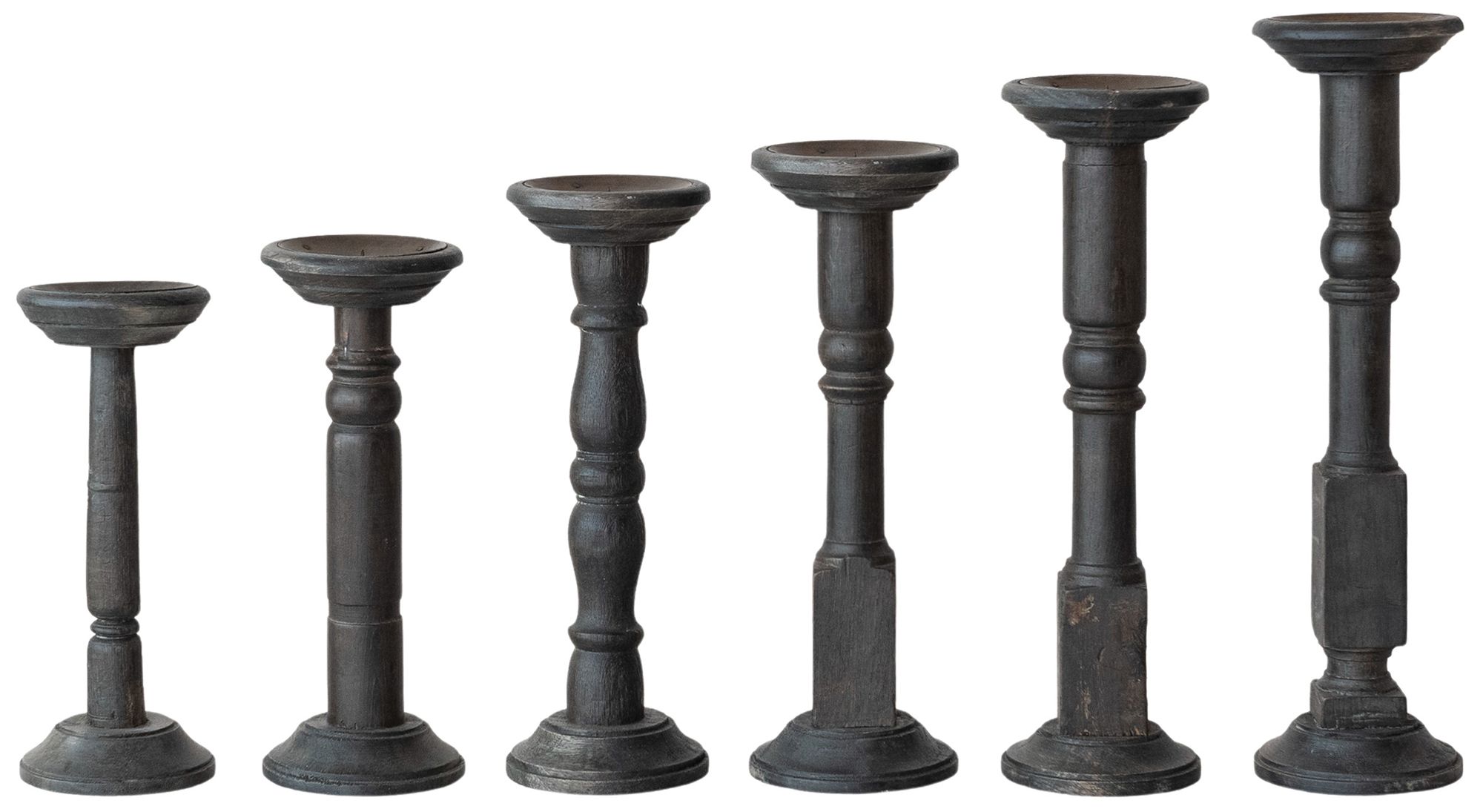 6-Piece Found Turned Wood Pillar Candle Holders, Black