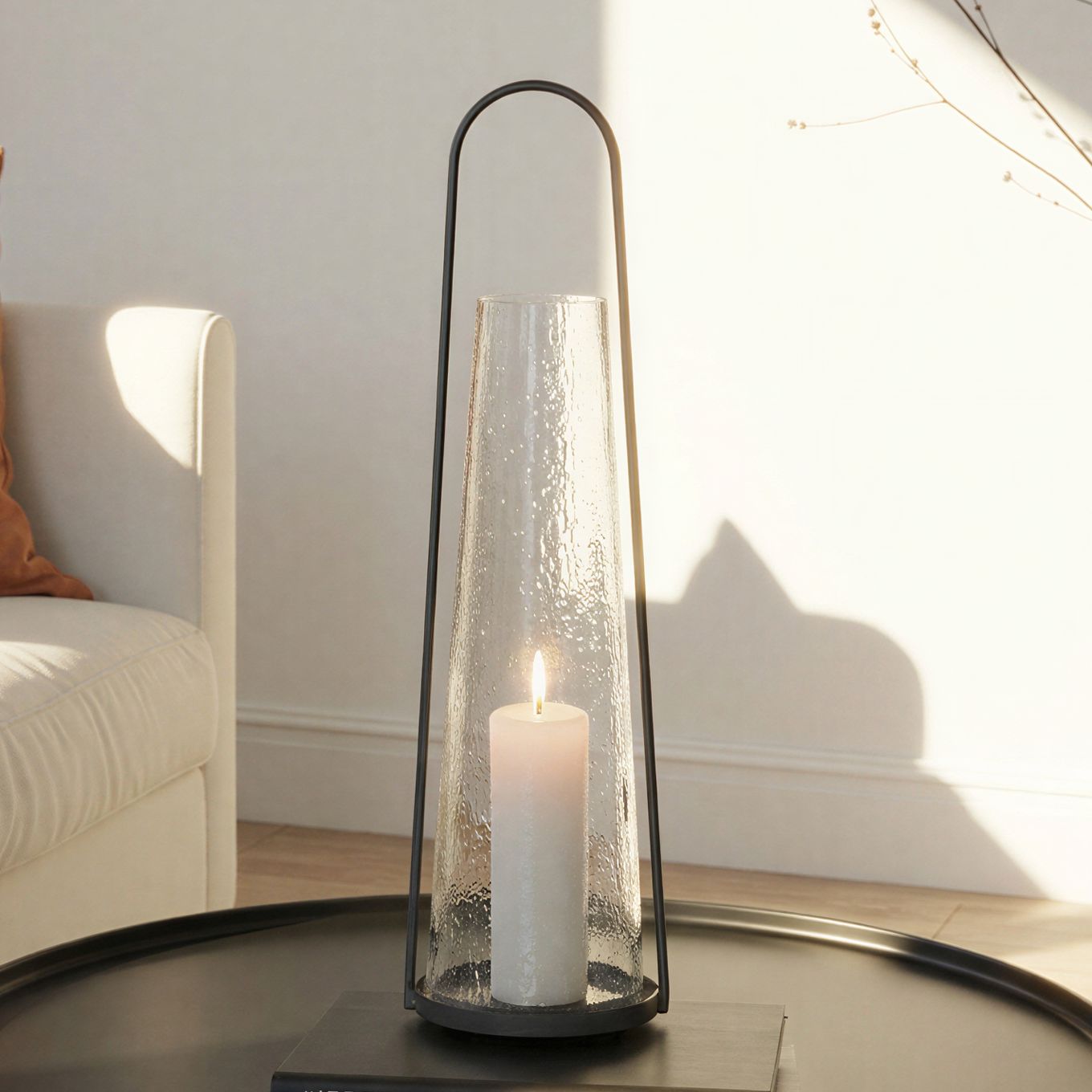 Round Metal Lantern Taper Holder with Hammered Glass Hurricane, Black