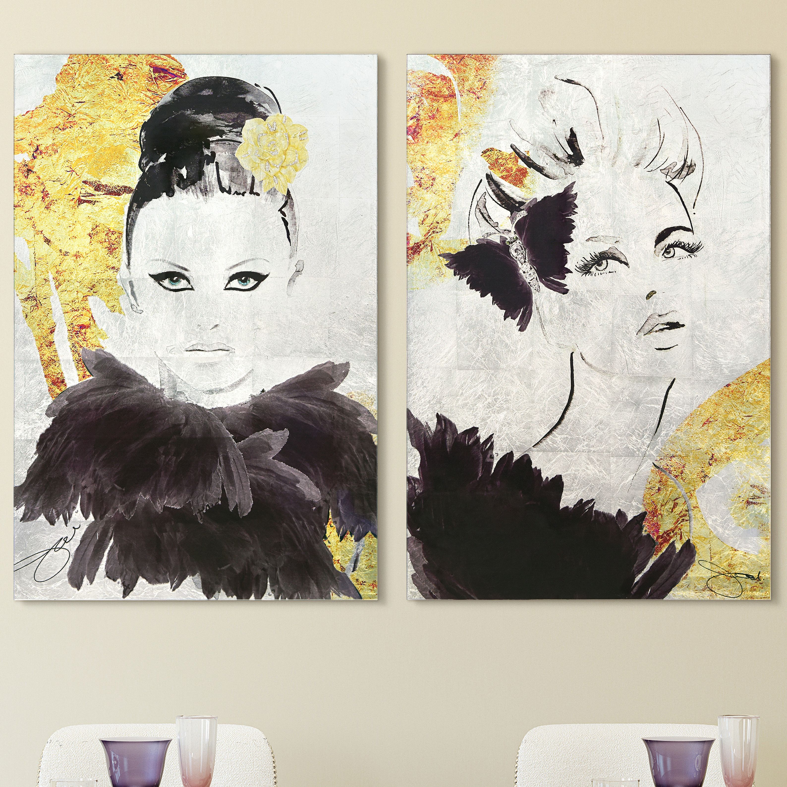 Gold Woman 1 & 2 Reverse Printed Tempered Glass Wall Art with Silver Le