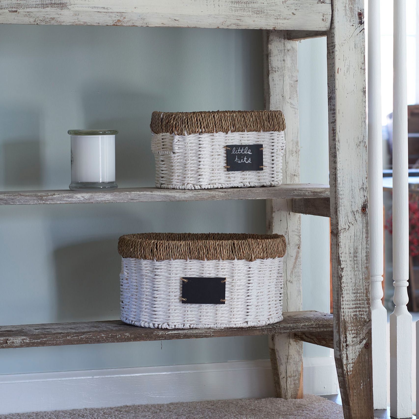 Natural Trim White Woven Oval Baskets - 2 pc. Set Paper Rope and Seagrass