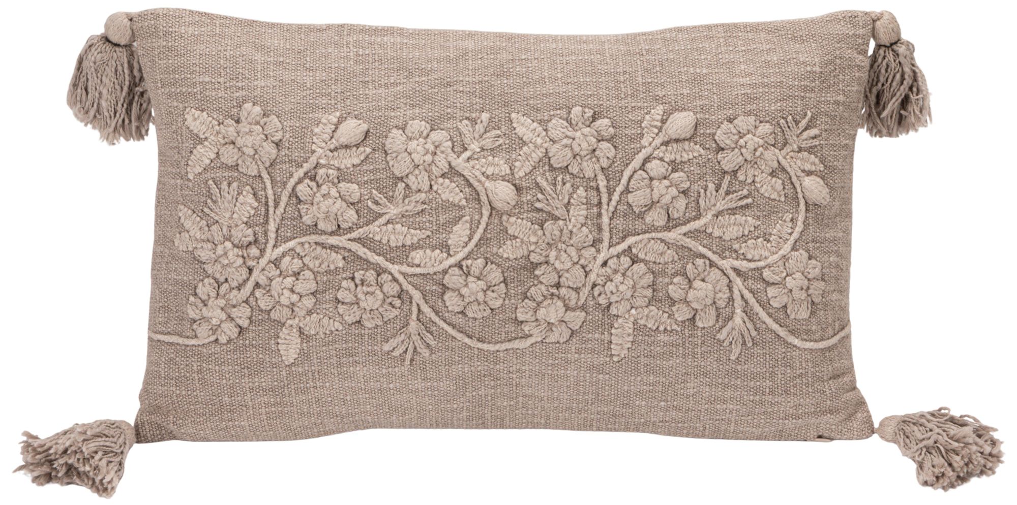 Stonewashed Cotton Slub Lumbar Pillow with Embroidered Flowers and Tassels