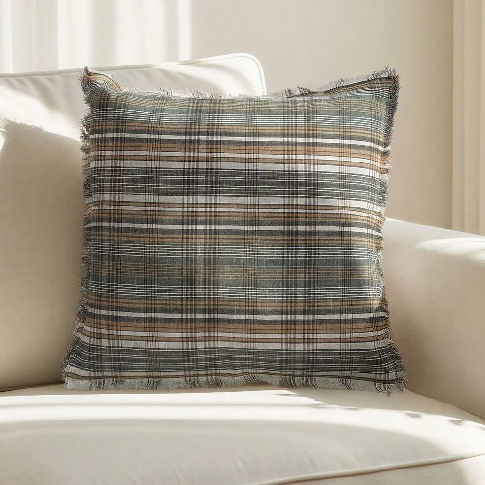 Woven Linen and Cotton Pillow with Plaid Pattern and Eyelash Fringe