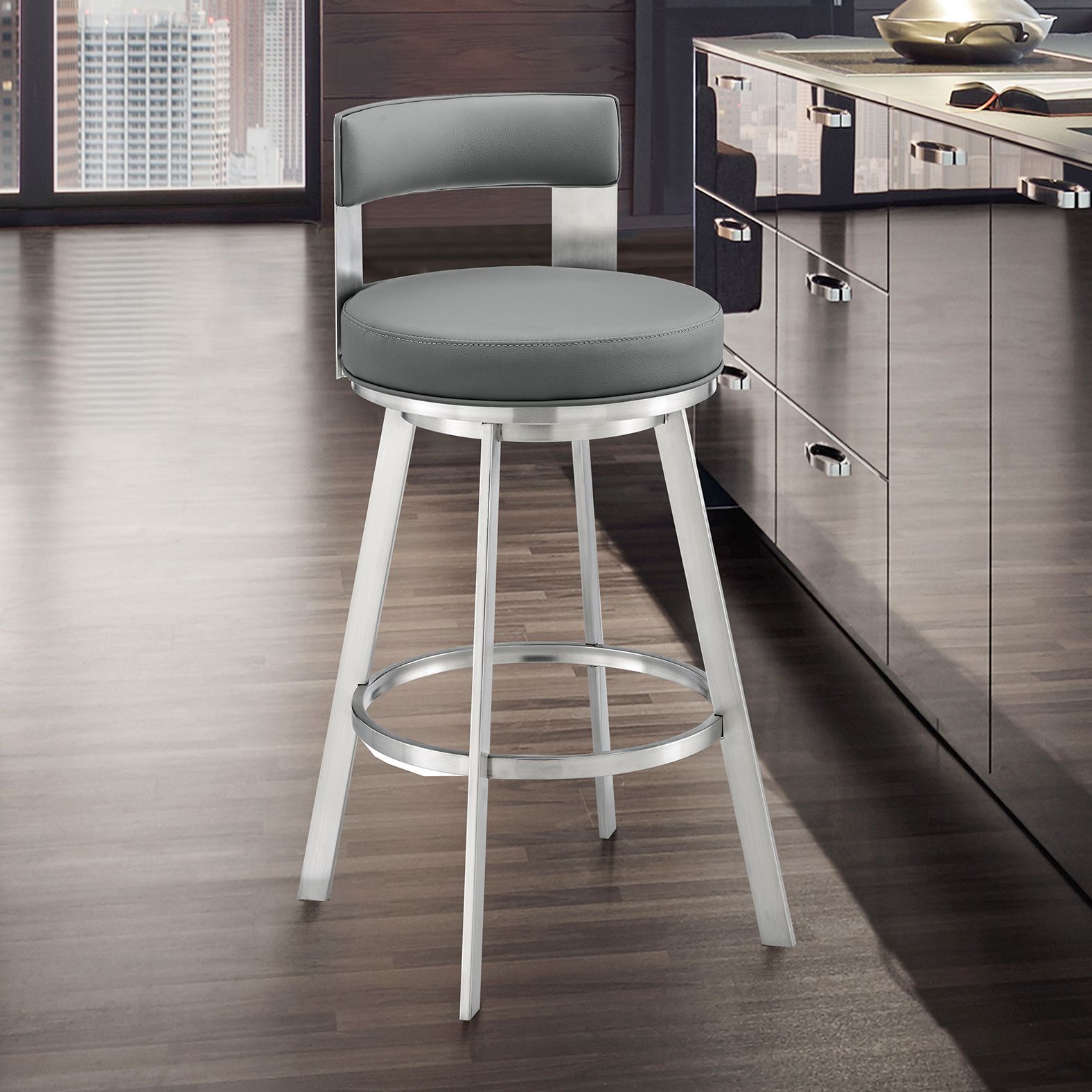 Kobe 26 in. Swivel Barstool in Brushed Stainless Steel, Gray Faux Leather