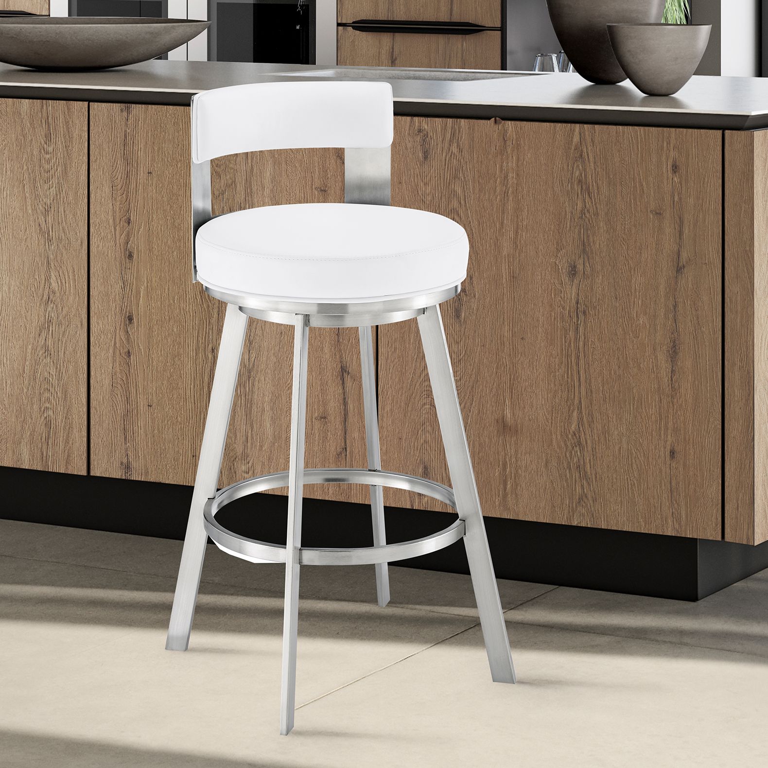 Lynof 26 in. Swivel Barstool in Stainless Steel, White Faux Leather