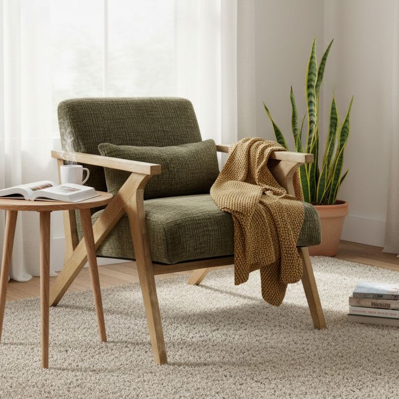 Green Upholstered Accent Arm Chair with Brown Wooden Frame
