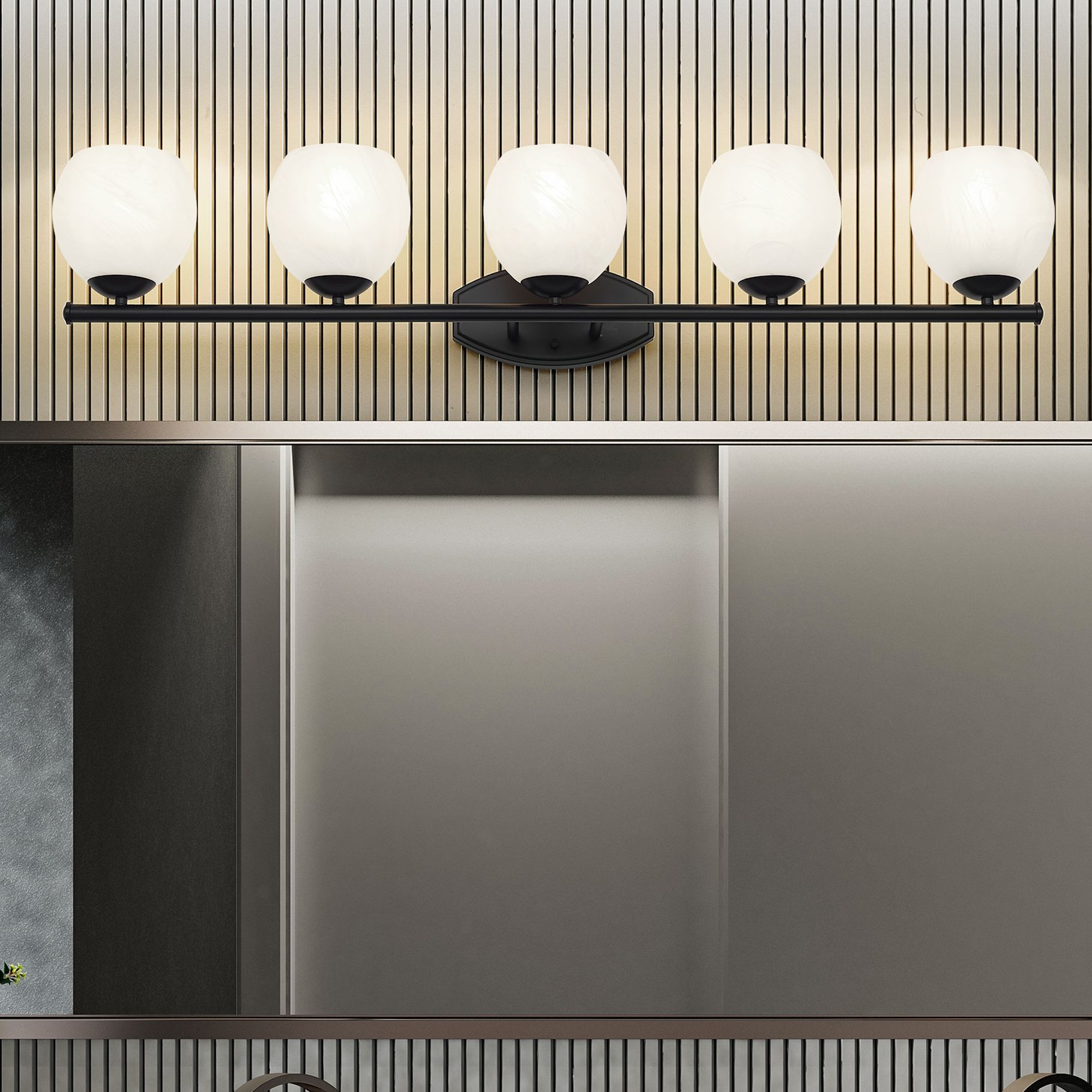 Z-Lite Colette Matte Black 5 Light Vanity with Feathered White Shade