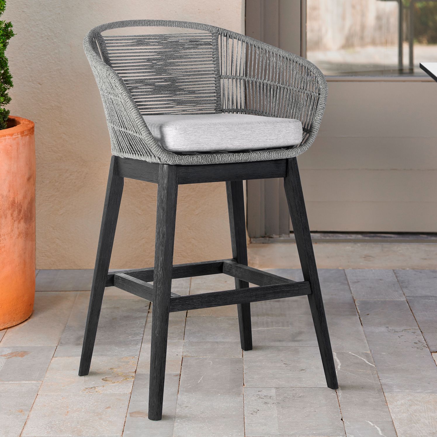 Hazel 26 in. Outdoor Barstool in Aluminum, Teak Wood, Argent Gray Cushions