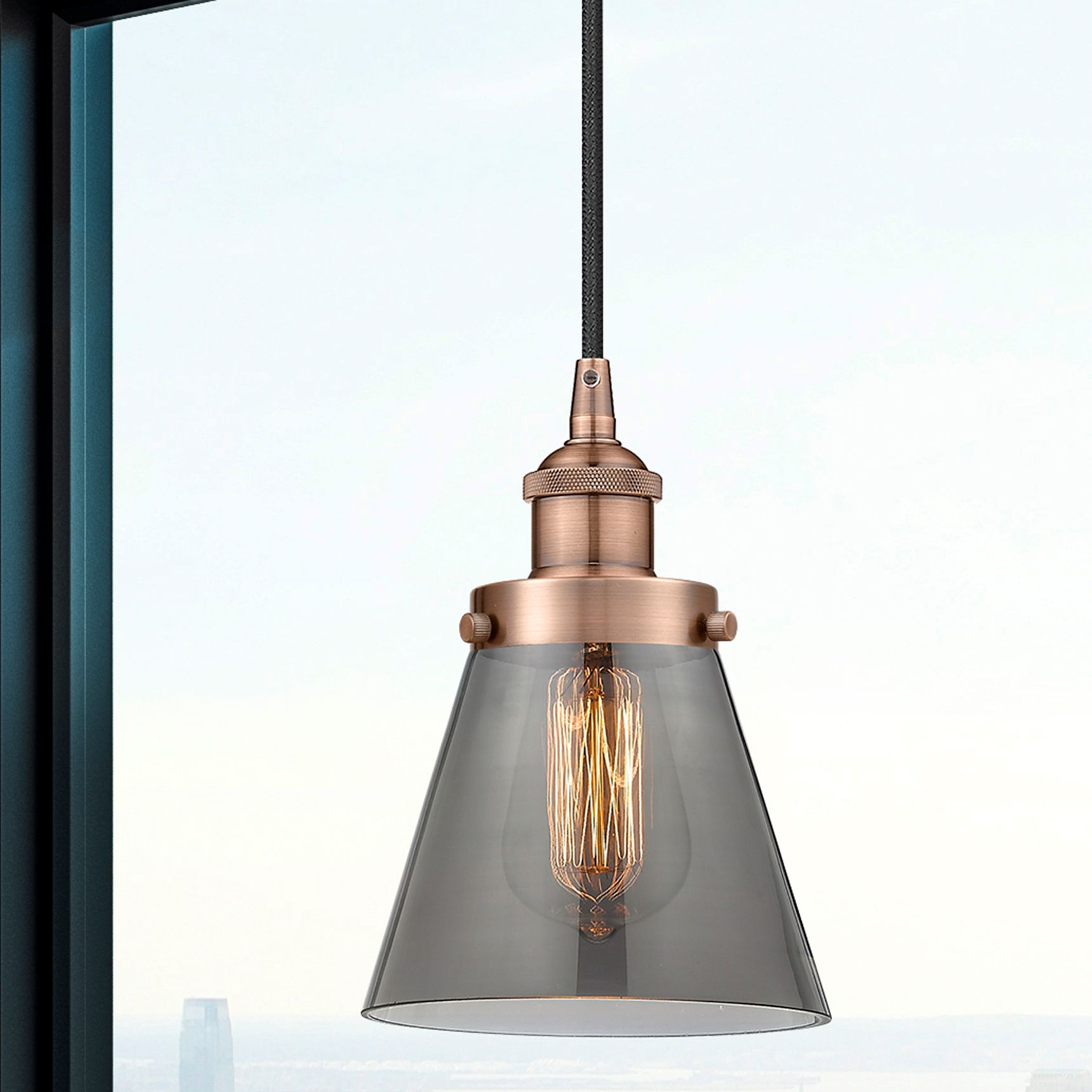 Cone 6" Antique Copper Mini Pendant w/ Plated Smoke Shade