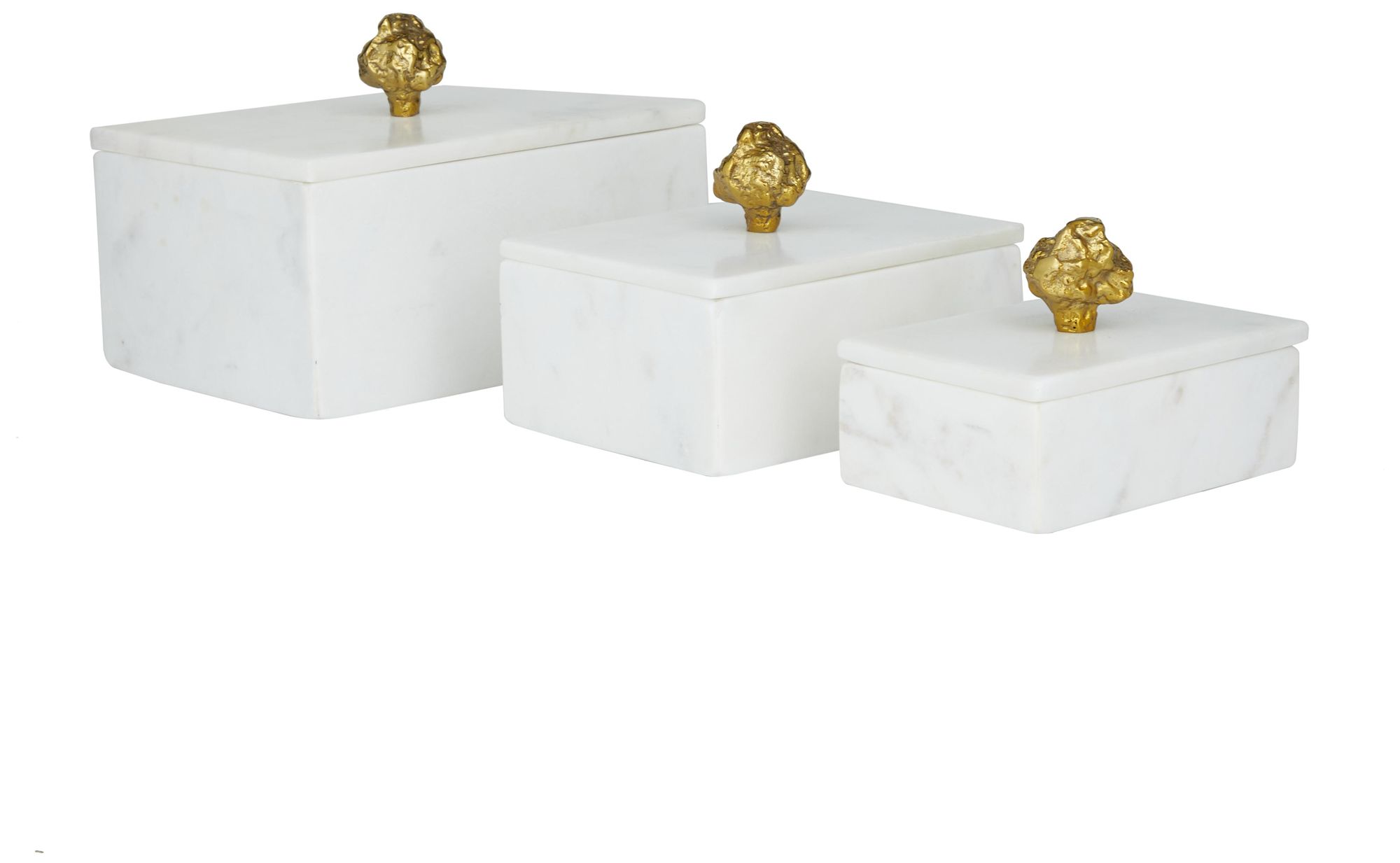 White Marble Decorative Box with Gold Finial, Set of 3 9", 7", 6"W
