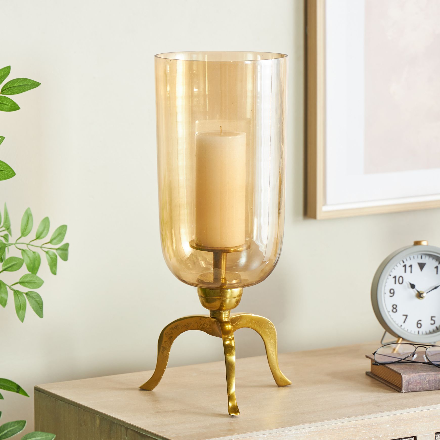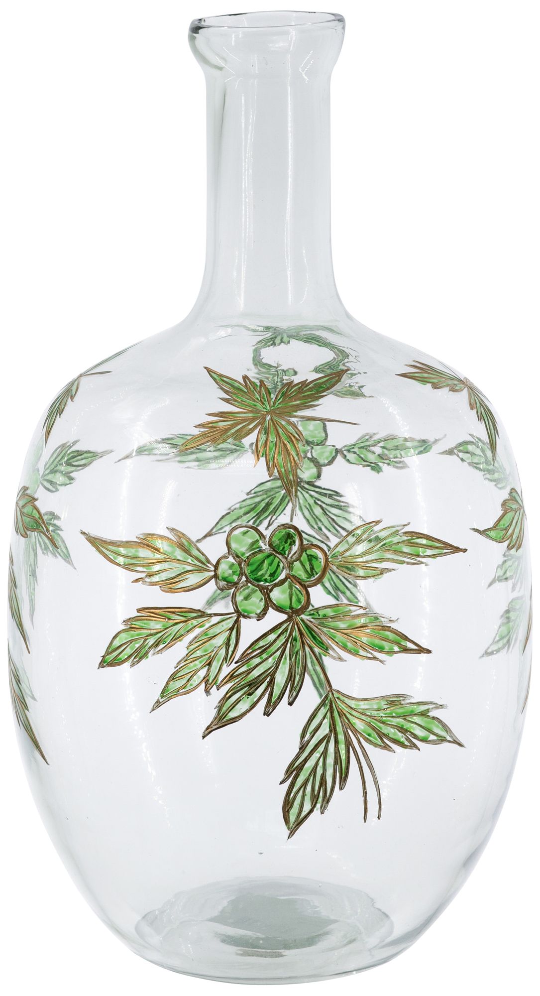 Rounded Clear Glass Vase w/ Narrow Neck & Green & Gold Botanical Design
