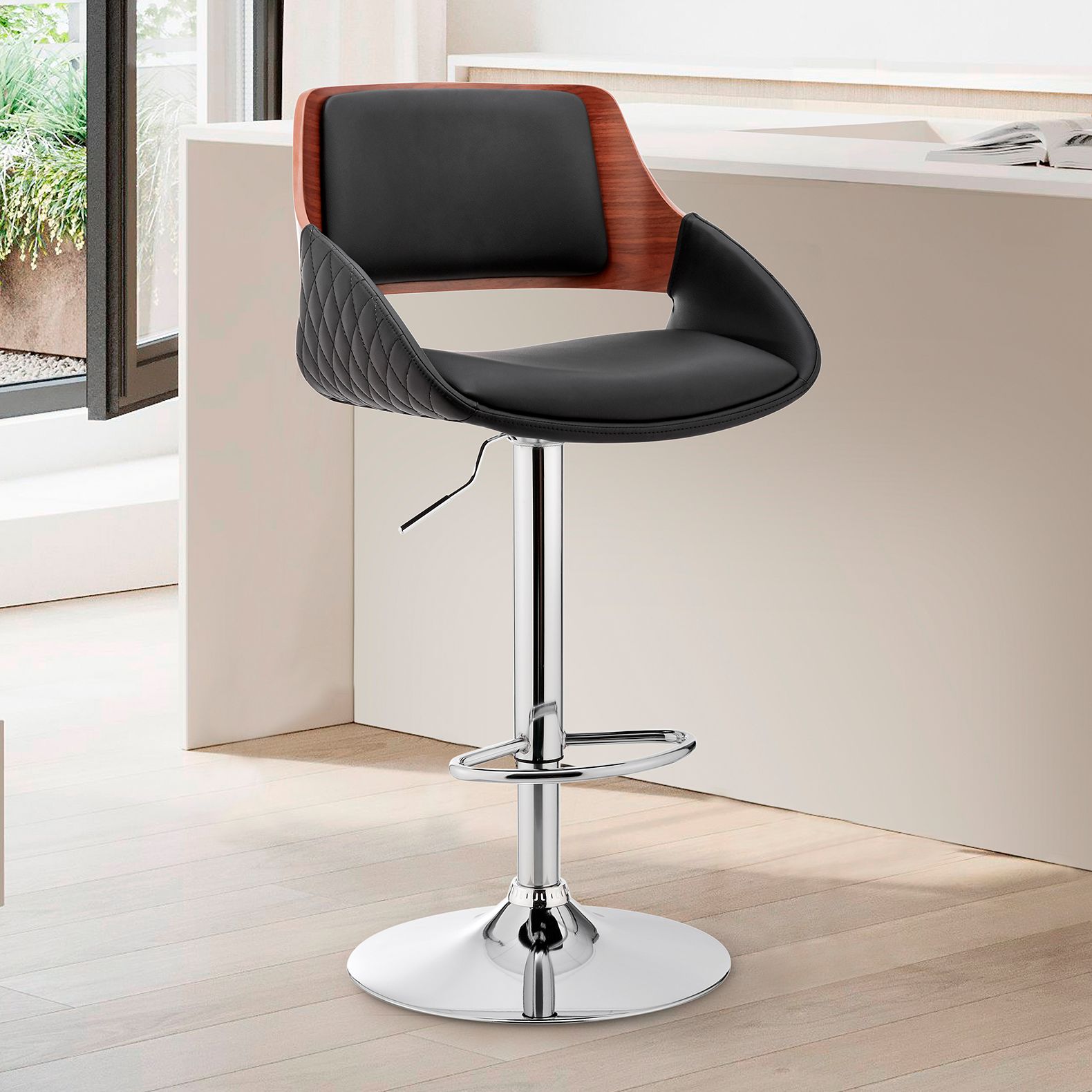 Java Adjustable Swivel Barstool in Black Faux Leather and Chrome Finish