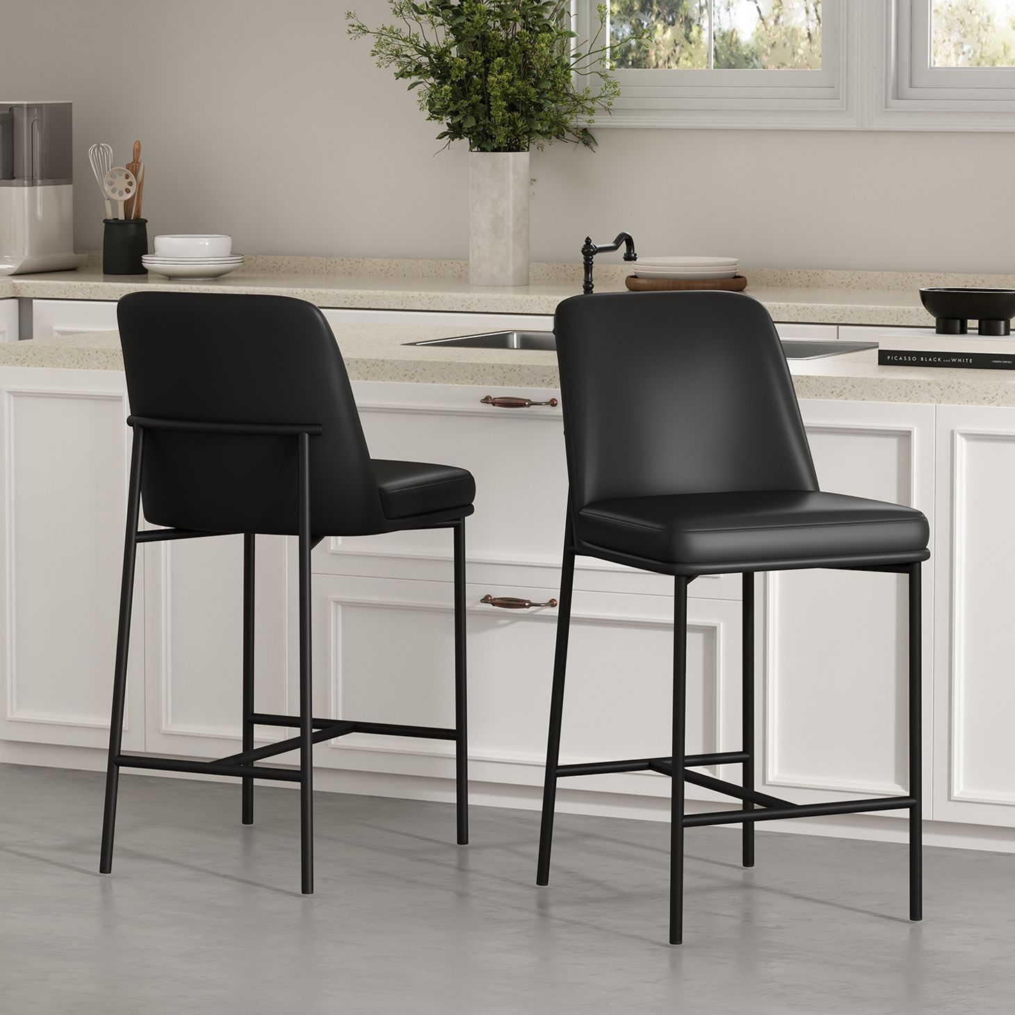 Loft Contemporary Vegan Leather Metal Counter Stool in Black - Set of 2