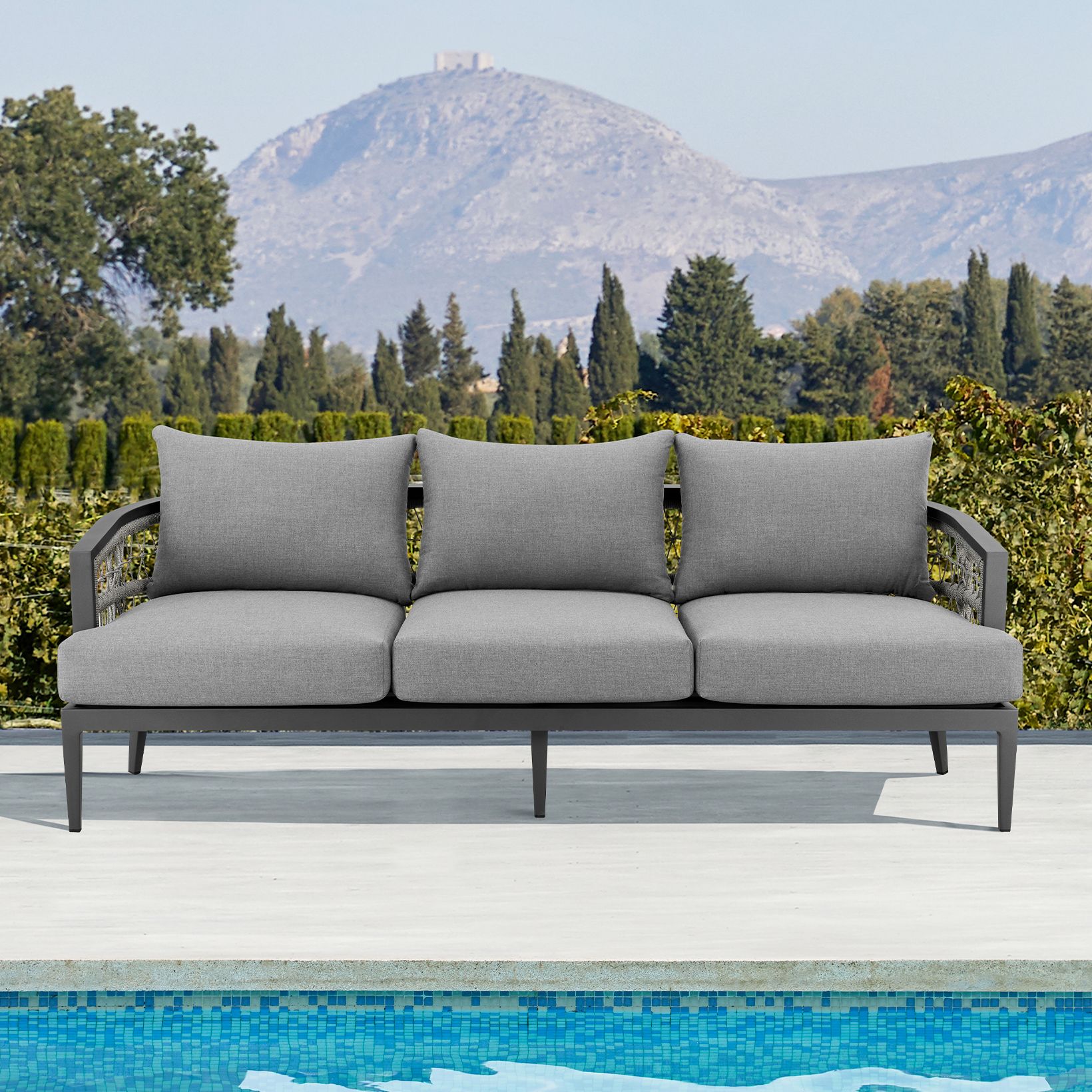 Zella Outdoor Sofa in Aluminum with Light Gray Rope and Earl Gray Cushions