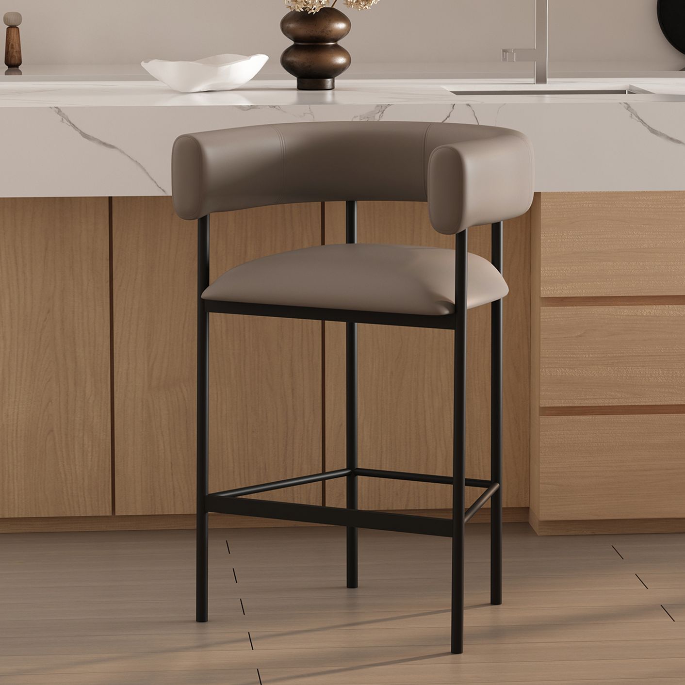 Onda Contemporary Vegan Leather Metal Upholstered Barstool in Taupe
