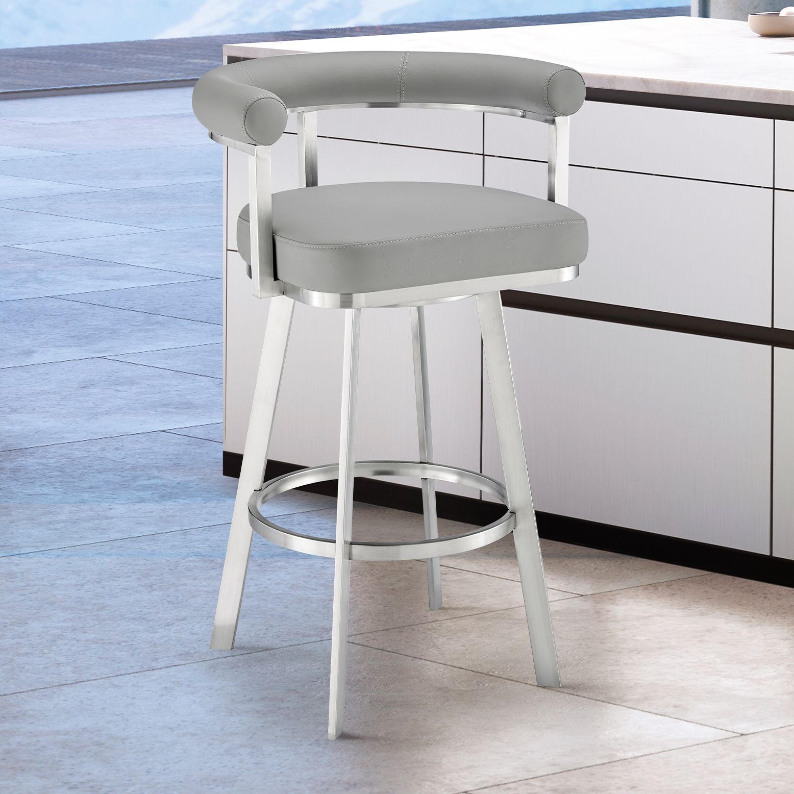 Nolagam 26 in. Swivel Barstool in Stainless Steel, Light Grey Faux Leather