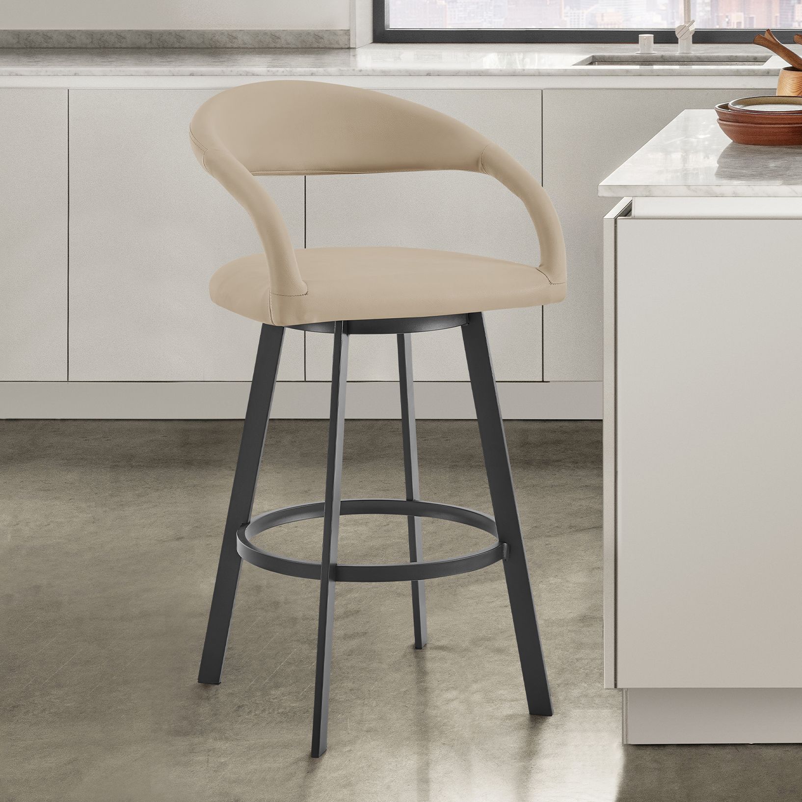 Ramona 26 in. Swivel Bar Stool with Matte Black Iron and Beige Faux Leather