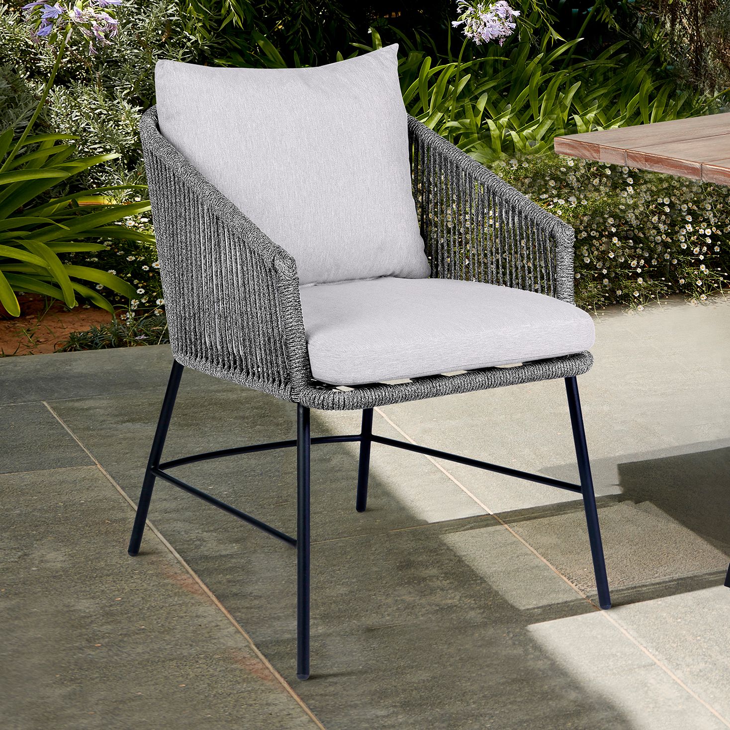 Calica Outdoor Patio Dining Chair in Black Metal and Grey Rope