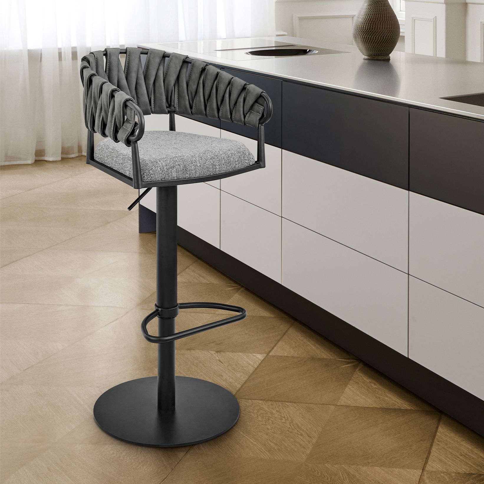 Blaise Adjustable Barstool in Gray Fabric and Faux Leather, Black Metal
