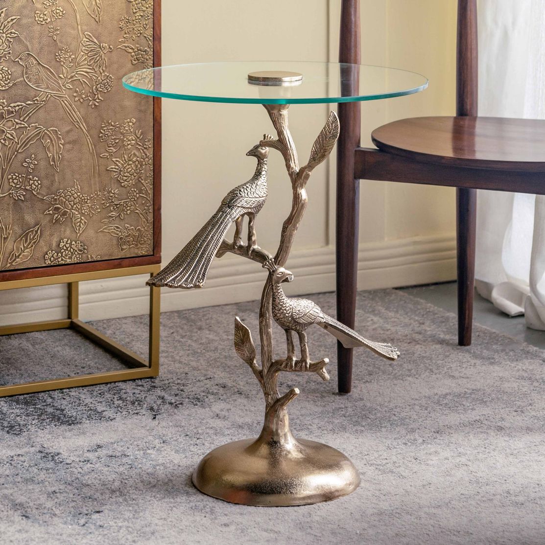 Gold Peacock Side Table w/ Round Glass Top - 17.5"Dia. x 24" - Gold, Clear