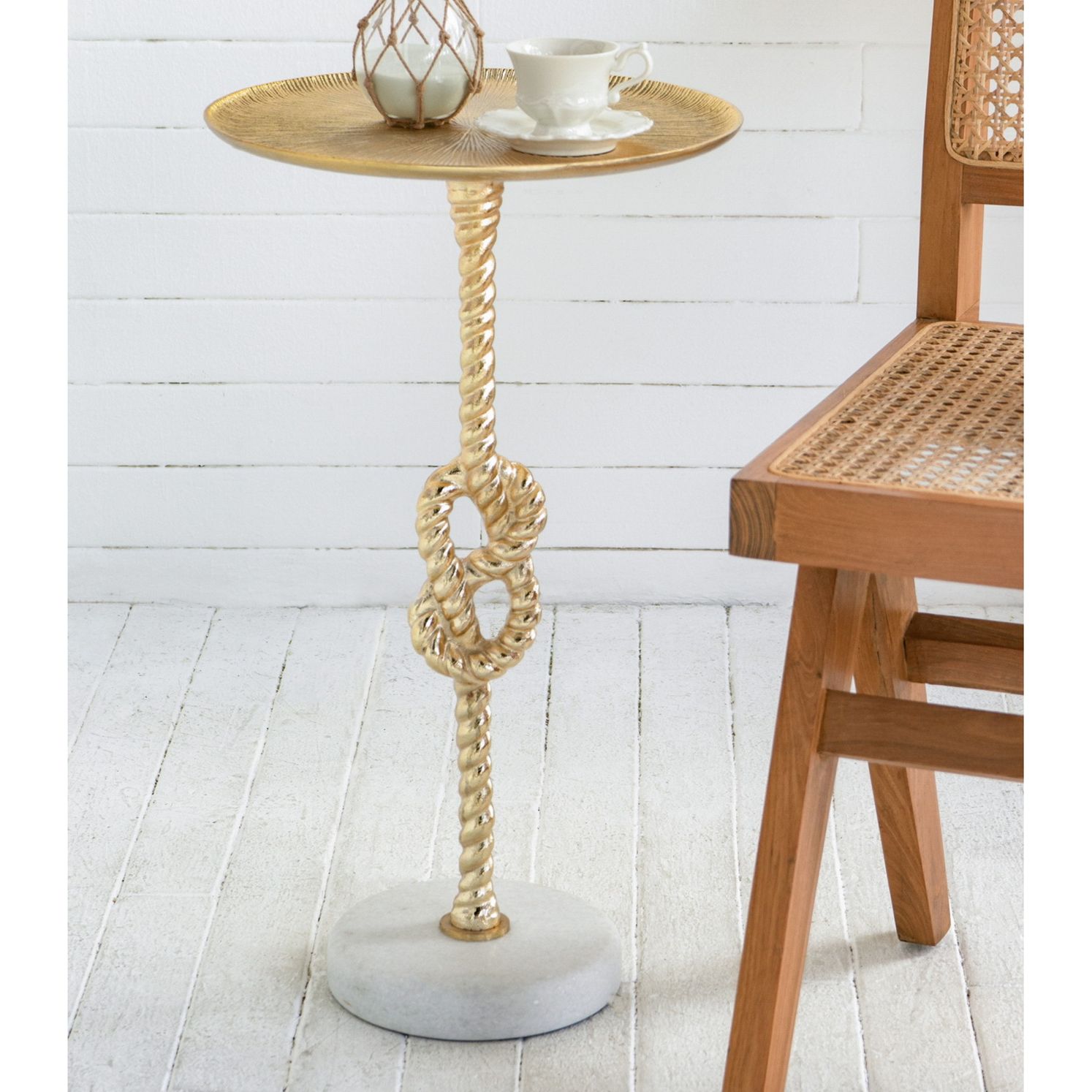 Gold Side Table w/ Rope Knot Design & White Marble Base
