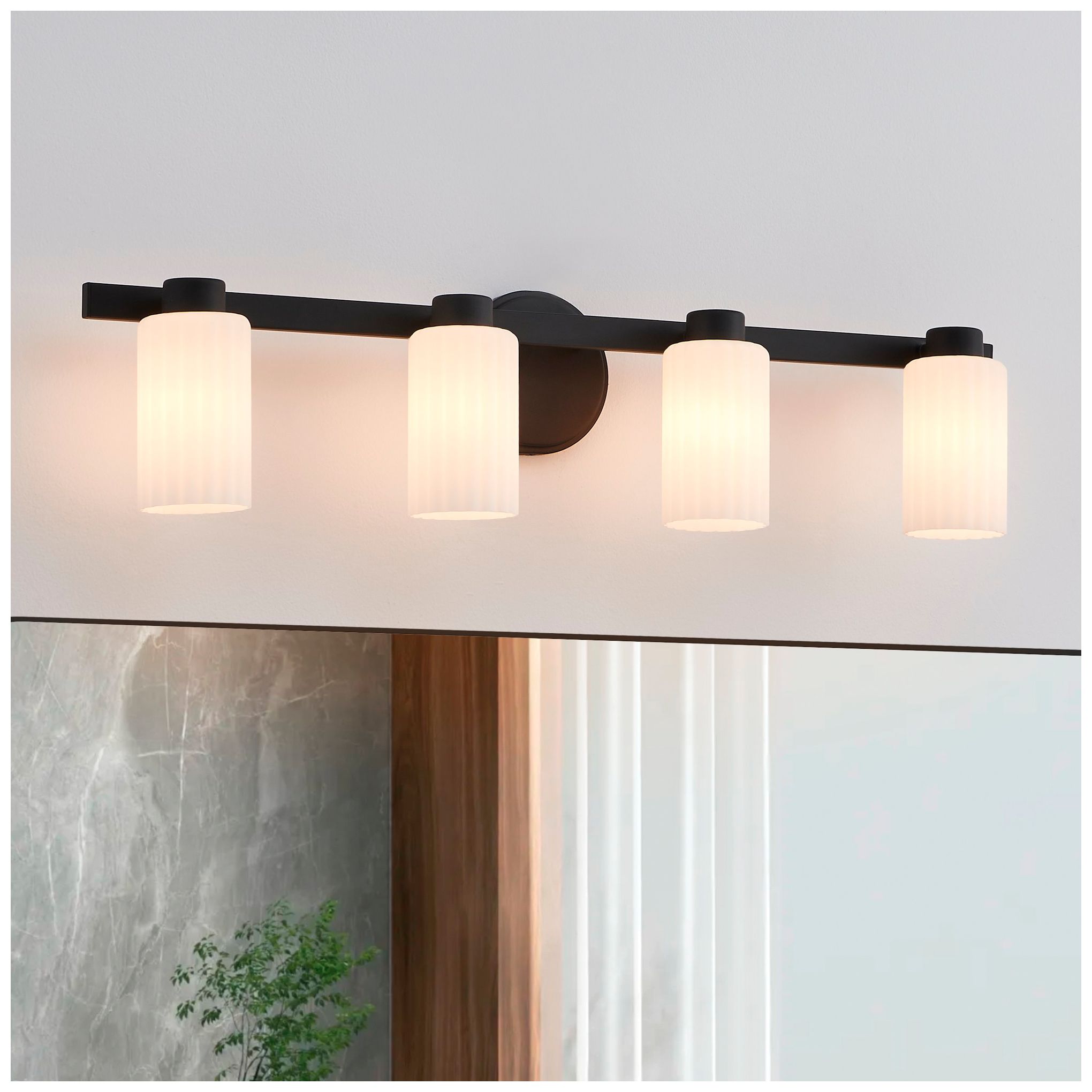 Thesis Bedminster 14" Matte Blk Vanity Light, Etched Opal Ribbed Glass